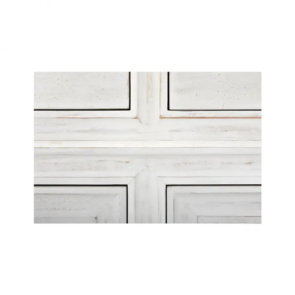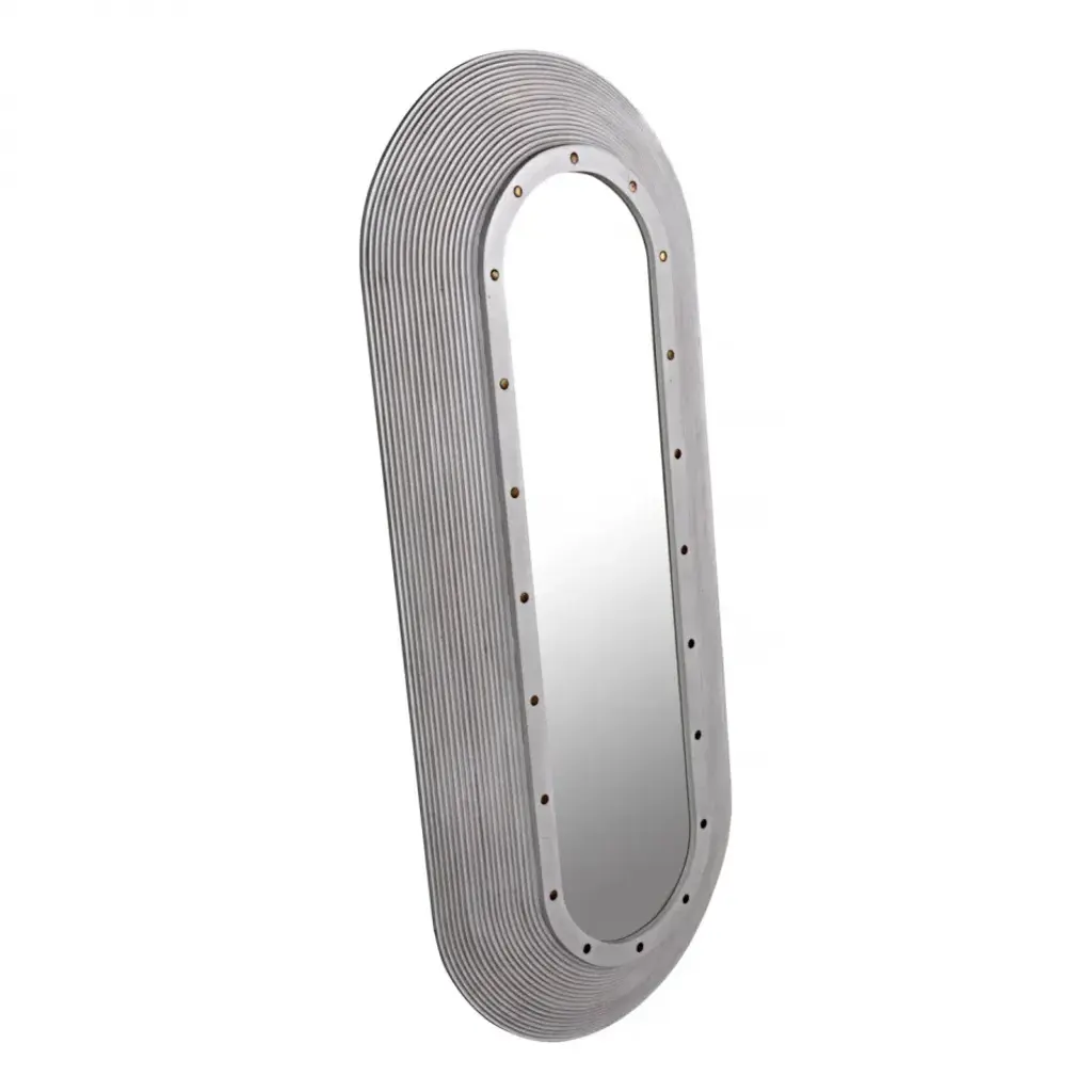 The Luna mirror combines a racetrack shape with a detailed stepped rib design in our white wash finish that reveals the warmth of the wood beneath. Antique brass hex dot button detail.