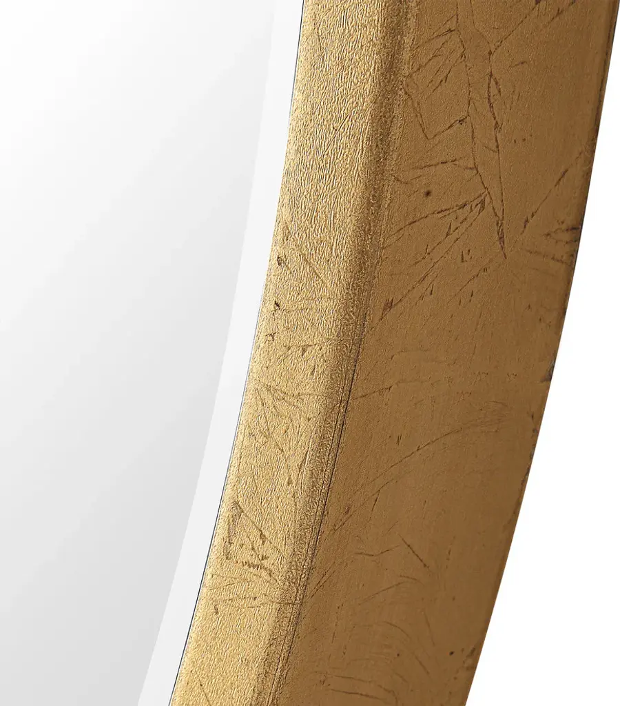 This unique iron frame features a delicate profile with ample depth, hand finished in a metallic gold leaf. Mirror features a generous 1 1/4" bevel.- 42"L x 39.25"H x 2" deep. Mirror Glass is 41.75 x 39". Weighs 34 lbs.- Hand Finished Iron Frame- Properly weighted hanging hardware attached.- Heirloom Quality - Expertly hand crafted and hand finished. Due to the hand crafted nature of this piece, each piece may have subtle differences.