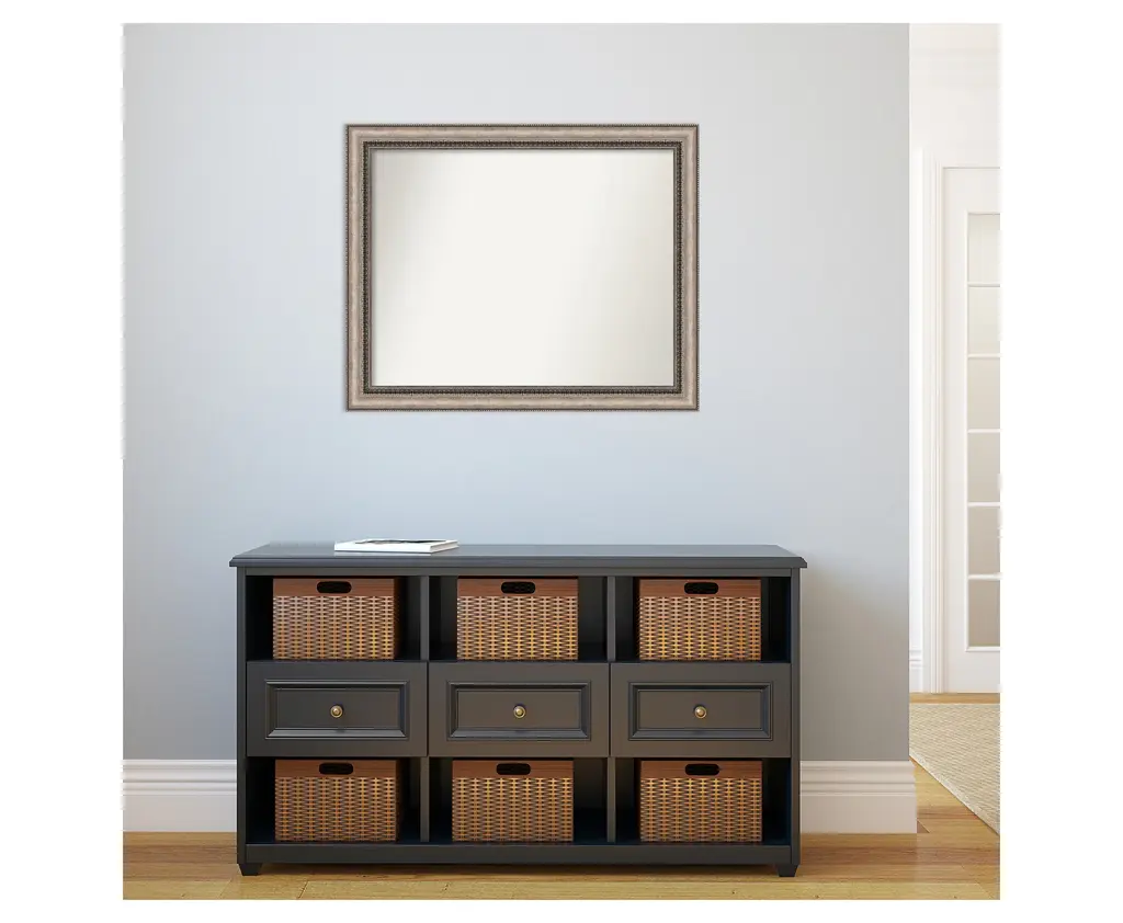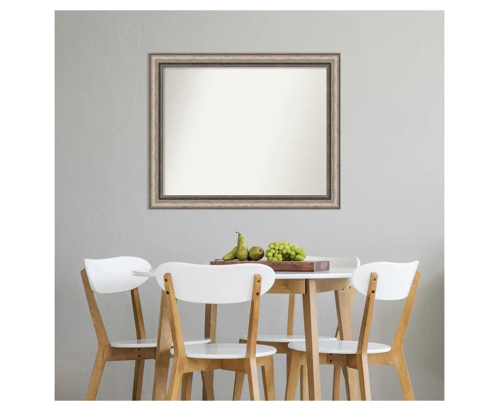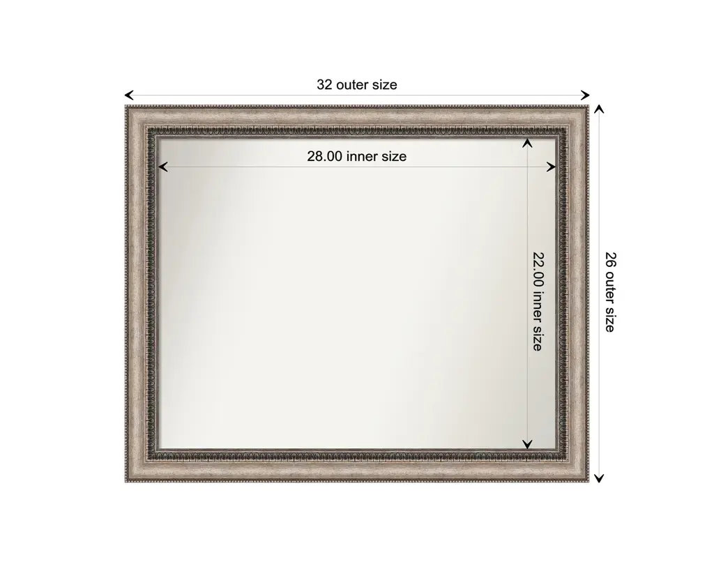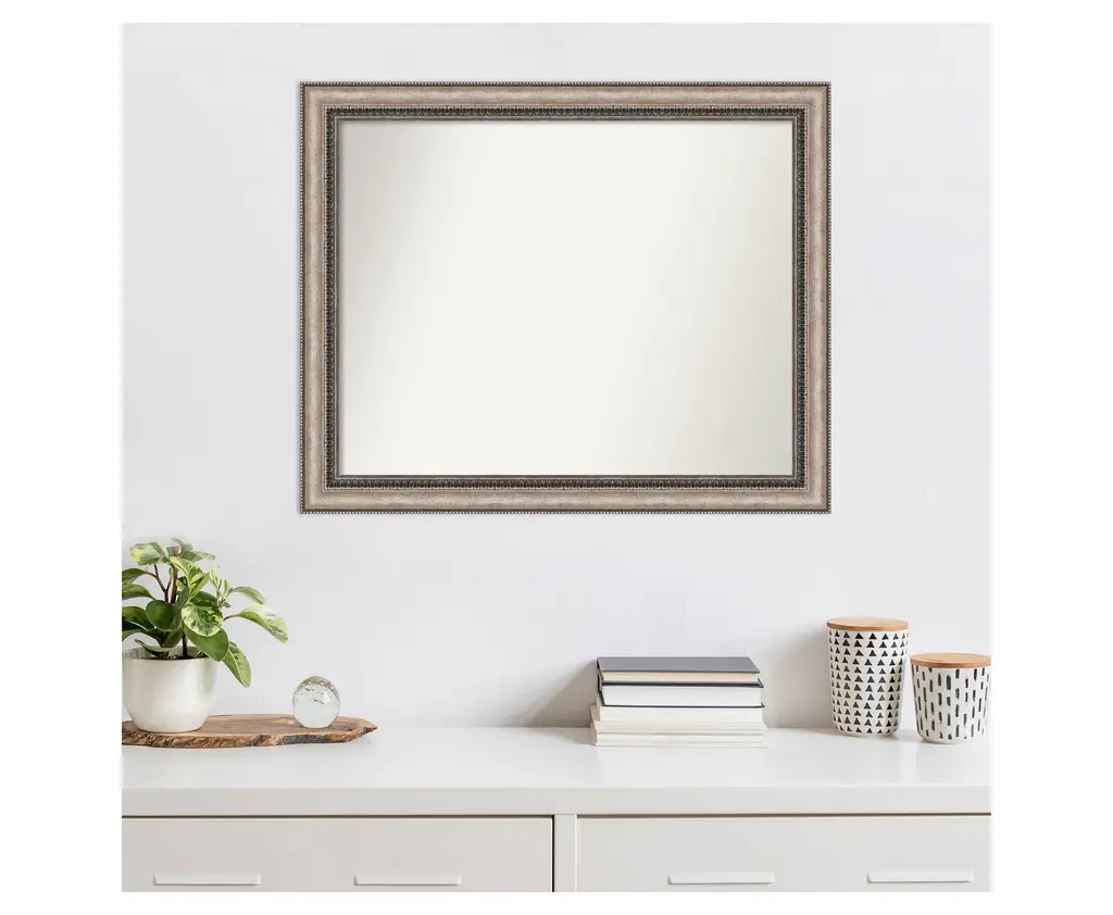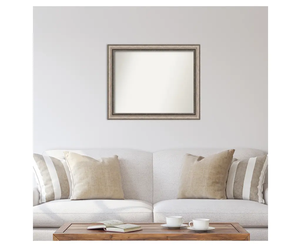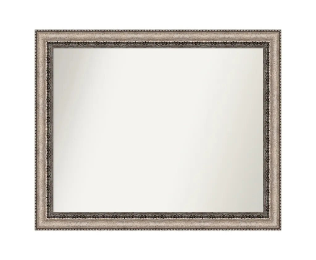 Give your home or office the finishing touch with this Non-Beveled Wall Mirror framed with the Lyla Ornate Silver frame. Individually made using traditional custom framing techniques, it has the quality you would expect from your local frame shop. It holds its value with premium finishing that can be appreciated up close.Features:MIRROR DETAILS: This mirror features premium glass for a clear, undistorted image and has a non-beveled surface to maximize the viewing area.FRAME DETAILS: The Lyla Ornate Silver Frame is a frame with a curved surface, beading on the outer edge, ornate design on the inner edge, and a warm, bronze-tone brushstroke finish. The frame is 2.25 in. wide and stands 1 in. off the wall.PROTECTIVE BACKING: This wall mirror is finished with a solid surface backing to ensure stability and prevent moisture and dust buildup.HASSLE-FREE HANGING: All mirrors have durable hanging hardware attached to the back to hang vertically or horizontally, along with hanging hooks and nails.ASSEMBLED IN THE USA: Each piece is assembled to order in Madison, WI USA.FOR HOME OR COMMERCIAL USE: Because of our attention to detail and focus on artistry, architects, interior designers, and homeowners alike choose this mirror to create beautiful living spaces.