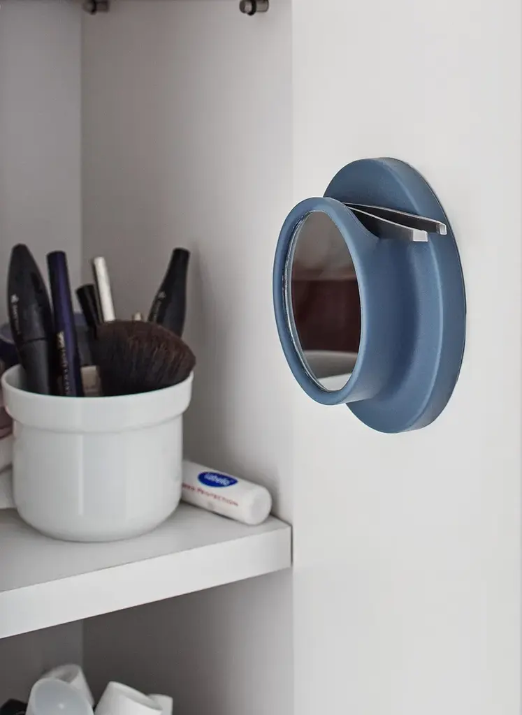 Small in dimensions but big in details. Macro is a mirror with enlarger function and a place designed to hold the tweezers. Macro was conceived for the wardrobe shutter or for the bathroom wall unit and it can be fixed at the desired height thanks to the adhesiveness of the polyurethane gel.