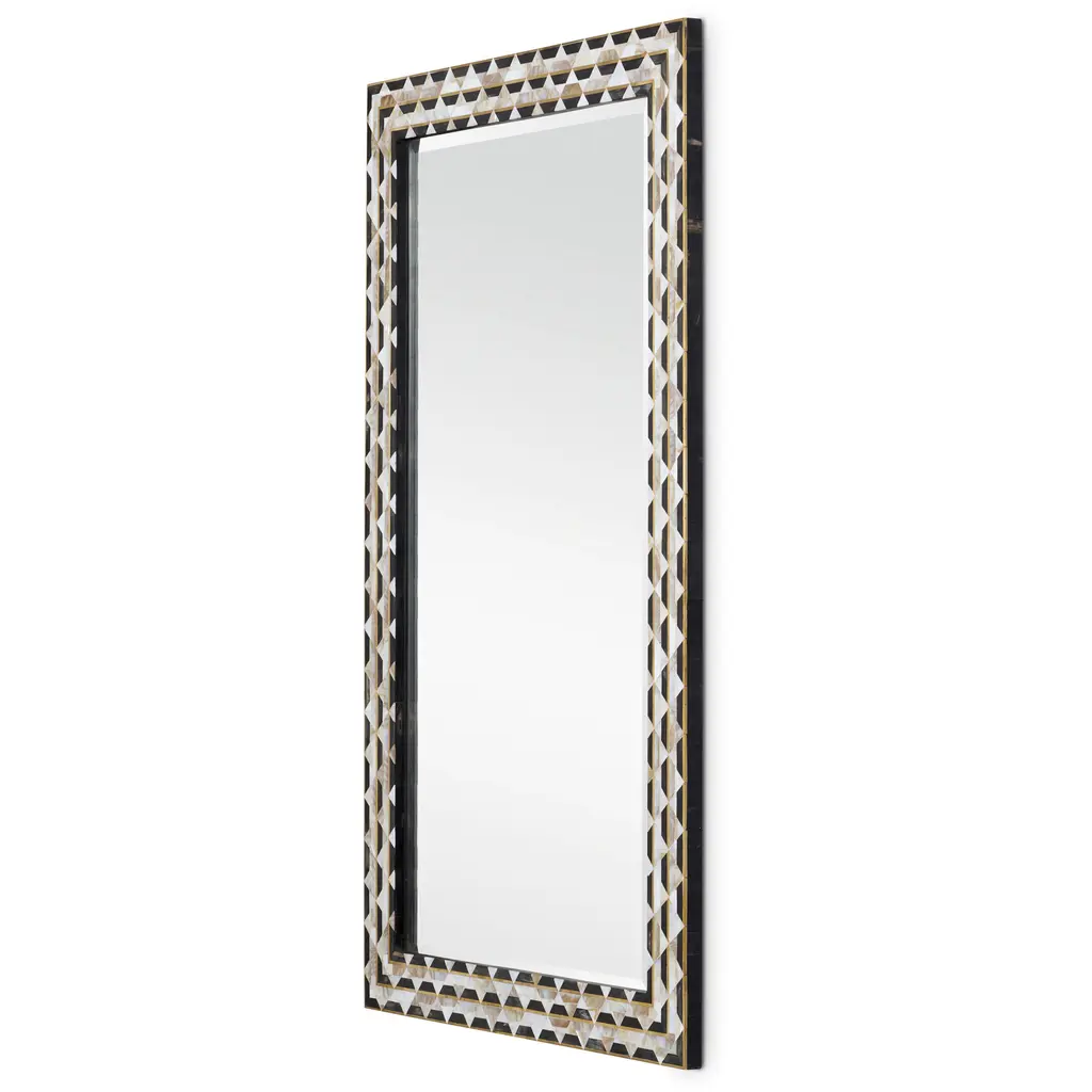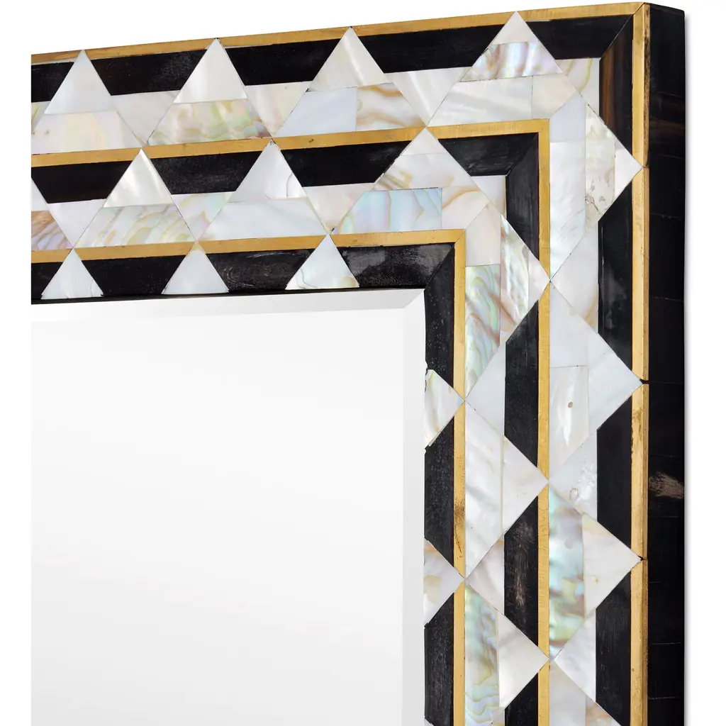 The Macy Rectangular Mirror has an intricate frame made of a sophisticated mix of materials that includes mother of pearl, horn, and brass. Not only does the shell on the black and white mirror shimmer, the black pieces of horn and the brass edging do as well. This is an artisanal offering, as every piece of material is hand-cut and hand-applied.