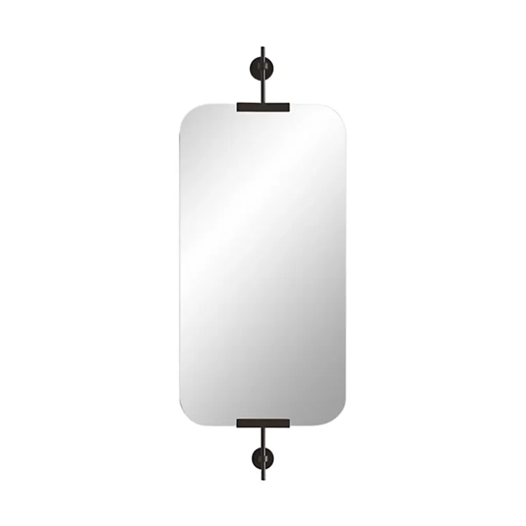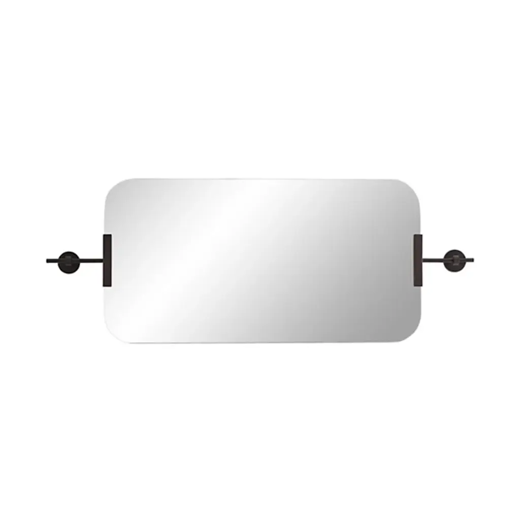 Elegantly displayed on the wall, the Madden Mirror by Arteriors brings a modern touch of charm to interiors. This rectangular mirror rounds gently at each corner for a softer aesthetic while its hovers daintily ahead of the wall. Two metal brackets hold the mirror in place, extending forward from matching wall mounts with angled clamps at each end of the piece. This mirror can be mounted to the wall either vertically or horizontally and seamlessly blends into any modern environment.
