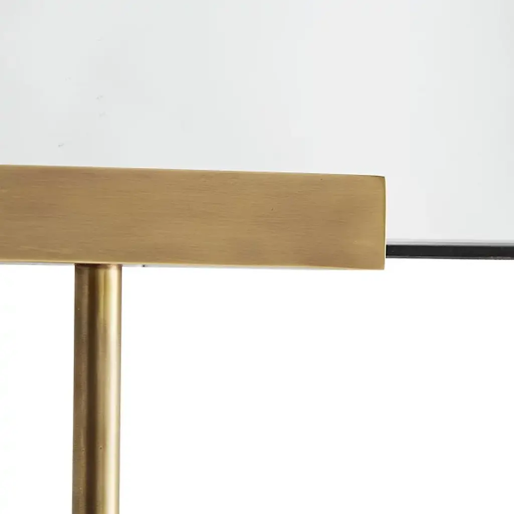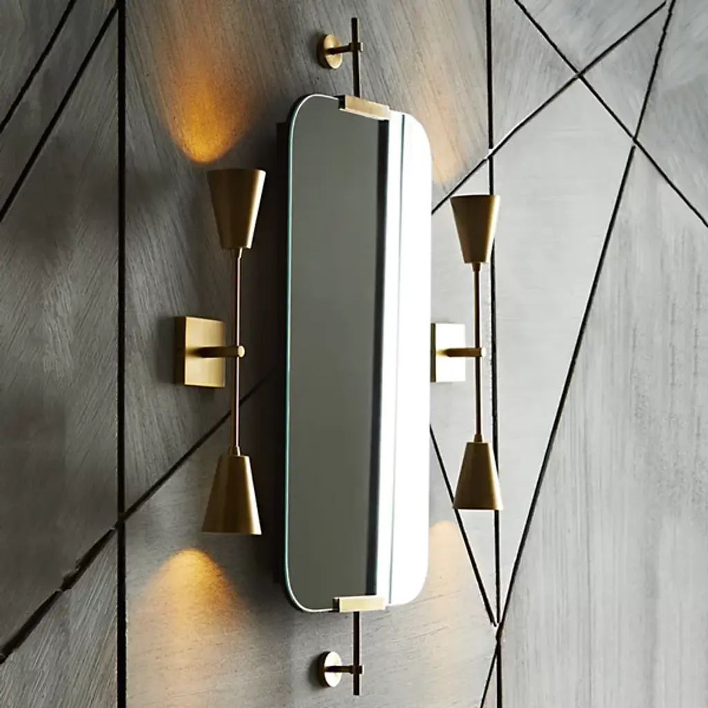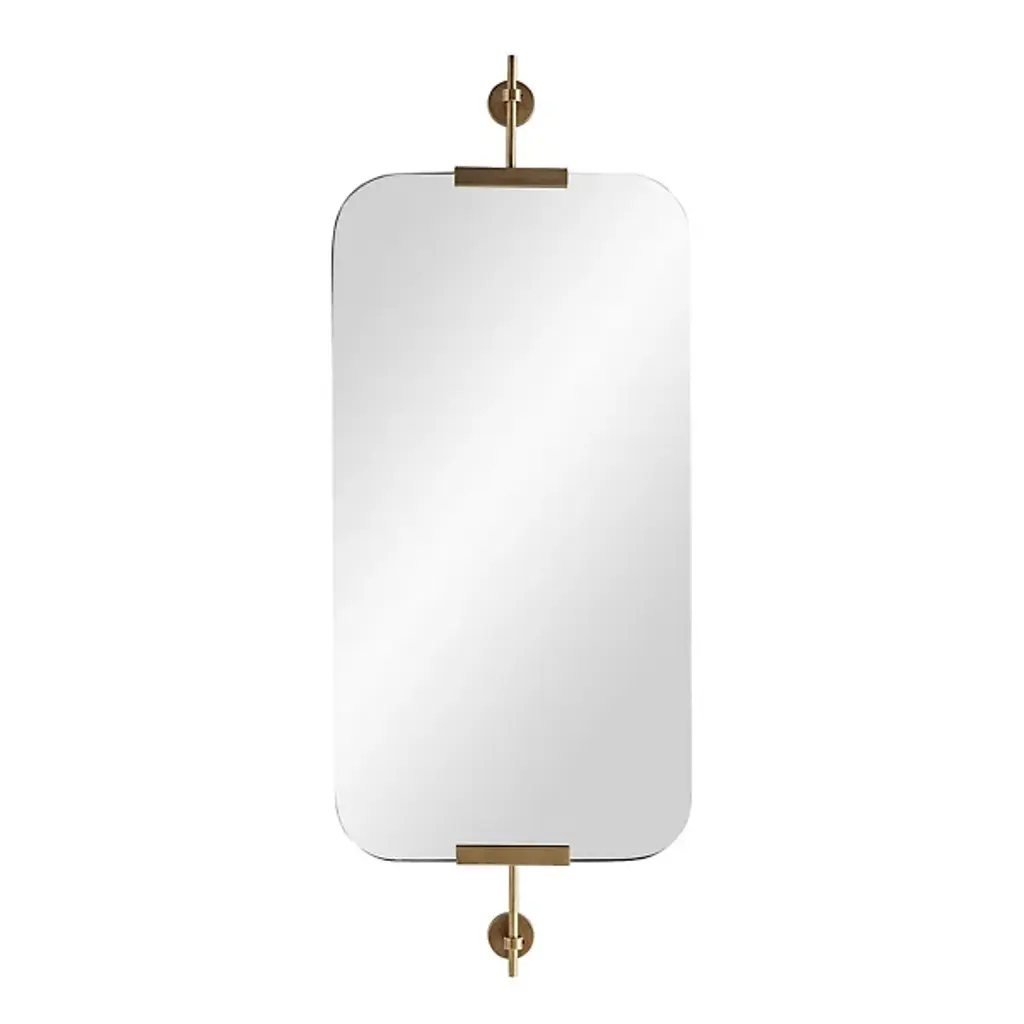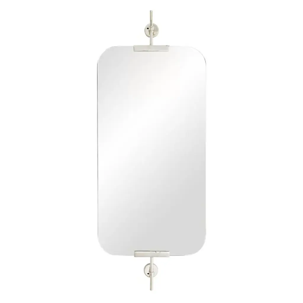 Elegantly displayed on the wall, the Madden Mirror by Arteriors brings a modern touch of charm to interiors. This rectangular mirror rounds gently at each corner for a softer aesthetic while its hovers daintily ahead of the wall. Two metal brackets hold the mirror in place, extending forward from matching wall mounts with angled clamps at each end of the piece. This mirror can be mounted to the wall either vertically or horizontally and seamlessly blends into any modern environment.