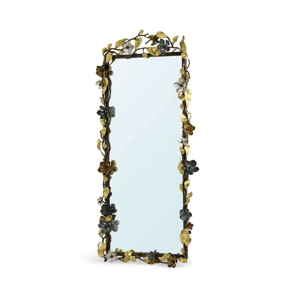 Magnolias have long been the symbol of nobility, perseverance, and love of nature. The grace and majesty of the magnolia blossom are brought to life in this extraordinary artistic mirror. The magnolia blooms are finished in highly polished brass and the stems, leaves, and surround are patinaed. Can be hung vertically. From a fashion forward perspective, Global Views offers accessories, furniture, statement lighting, and an assortment of rugs and mirrors to add beauty and joy to your home.
