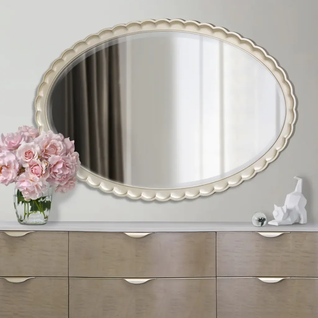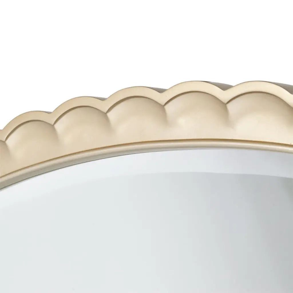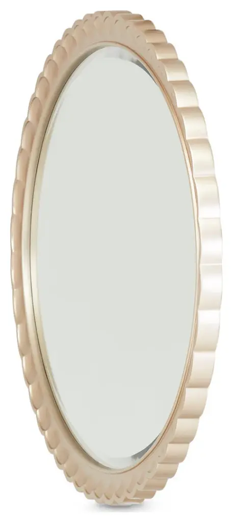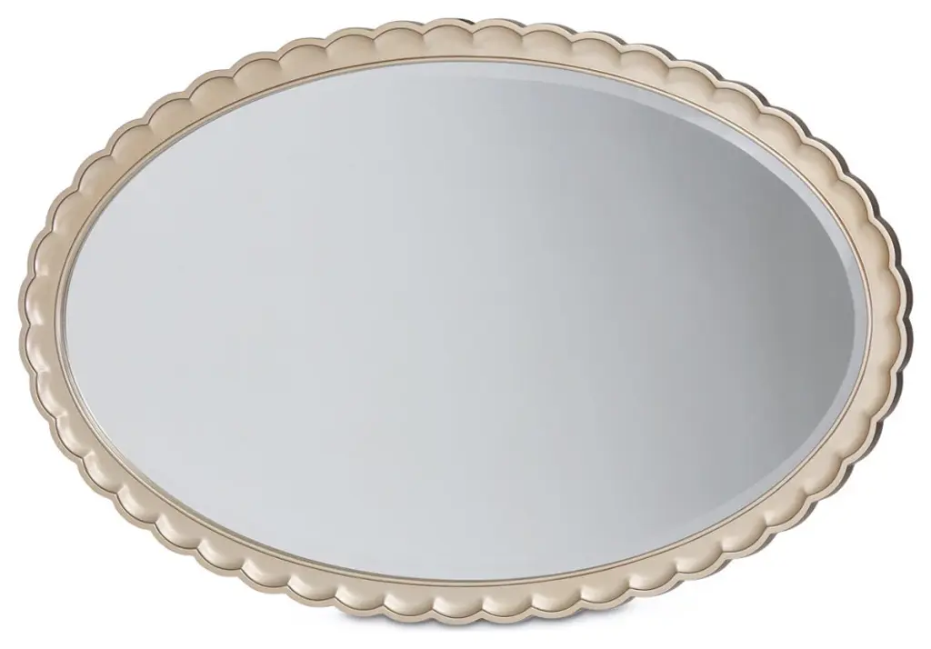 If you love eye-catching accents, the Malibu Crest Mirror is for you! Designed with gorgeous scalloping, a chic Chardonnay finish and beveled mirror glass, this piece is guaranteed to match your sophisticated style.Mirror features an oval shapeFrame features a scalloped trim finished in ChardonnayMirror mounts to the wallPairs with the Sideboard and Dresser, but can be used as an accent mirror as wellProduct Dimensions: 35"H x 54"W x 2"D | Weight: 43 lbs