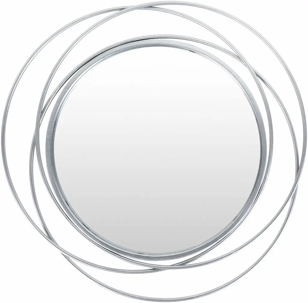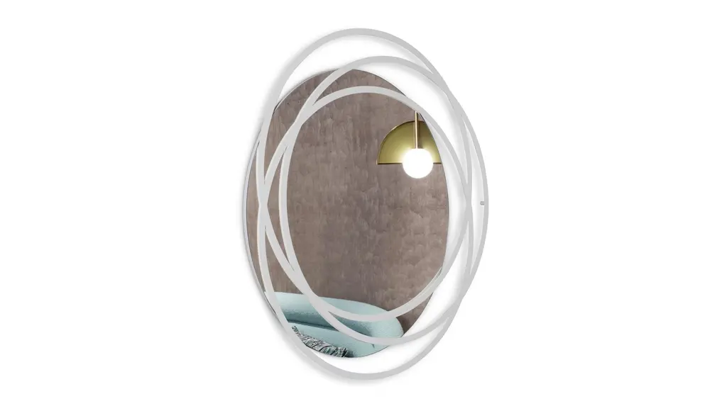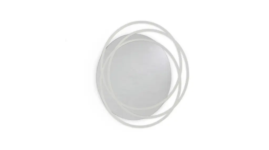 MANDALA, miroir de forme ovoïdale, est décoré de trois ellipses désaxées en acier dont le jeu de superposition et de décalage crée un effet graphique hypnotique, à l'image des Mandalas.