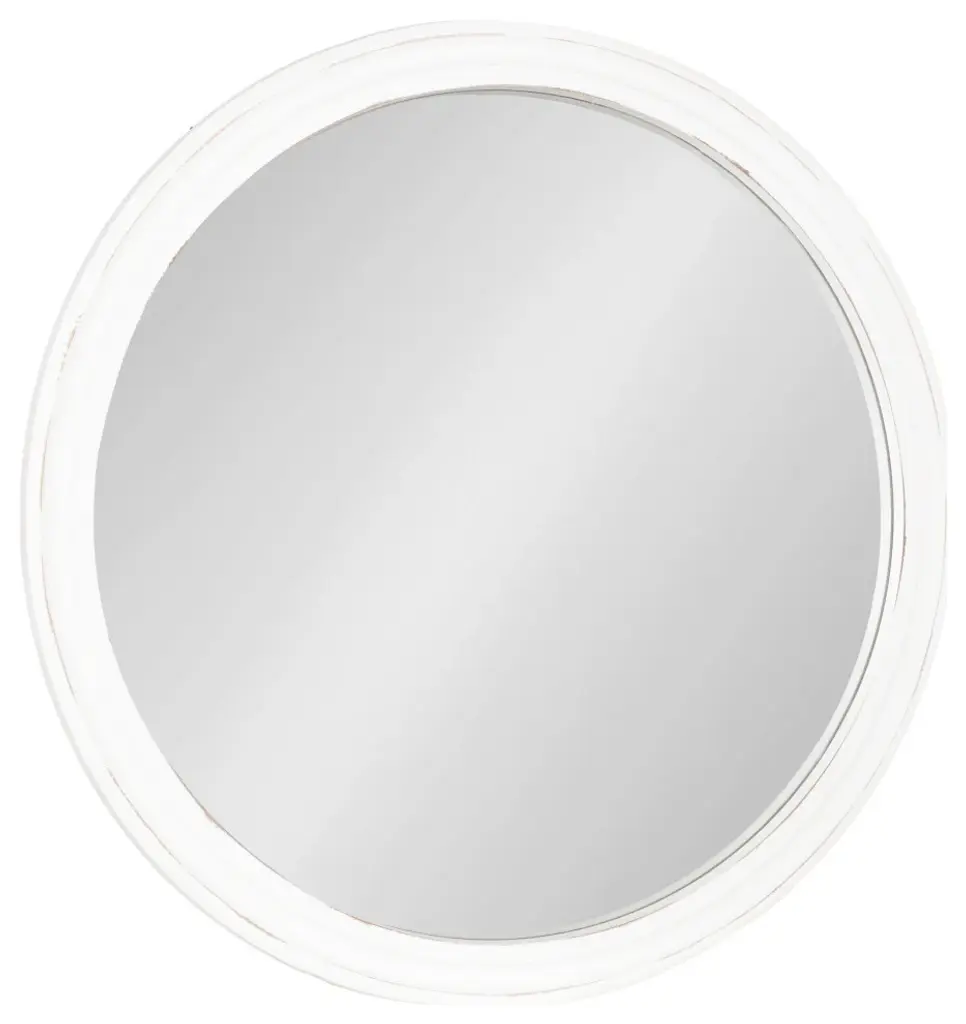 Make a bold and sophisticated statement on your wall with the transitional style of the Mansell decorative wall mirror. The round circular-shaped glass mirror is bordered by a well-built, ornamental frame. The wooden frame has a distressed white finish and features a sloped style and is made of a durable, textured wood. Hang this lovely statement piece proudly over your vanity, dresser, shelf, or hang it as an accent piece in the living room, dining room, family room, or bedroom. The shape will be a great way to break up the straight lines of a gallery display or just the right size for a smaller wall space. No matter the setting, it is sure to add a warm, charming visual appeal. The outside diameter of this round mirror is 28 inches. The actual mirror is 24 inches in diameter. To keep your installation simple, the Mansell wall mirror features metal D-ring hangers securely attached to the back of the wooden frame. • RUSTIC MIRROR: The round shape of the mirror is a beautiful addition to any room with transitional style and charm • QUALITY MATERIALS: The bold, round mirror has a resilient, quality wooden construction, with a scooped profile that brings a textural look to your wall• LARGE SIZE: Thie Mansell mirror has a 28 inch diameter, creating the perfect large-sized accent for your wall• ILLUMINATES: A well-placed mirror will enhance and lighten a space and is easily featured above a vanity or desk, fireplace, or sofa for extra brightness with a beautiful touch• EASY TO HANG: Two hangers come installed on the back and are D-Ring type keeping the mirror flat and secure against a wall