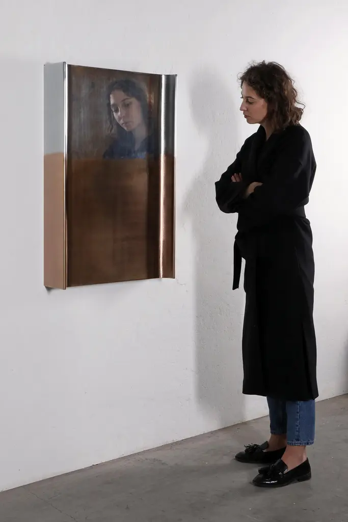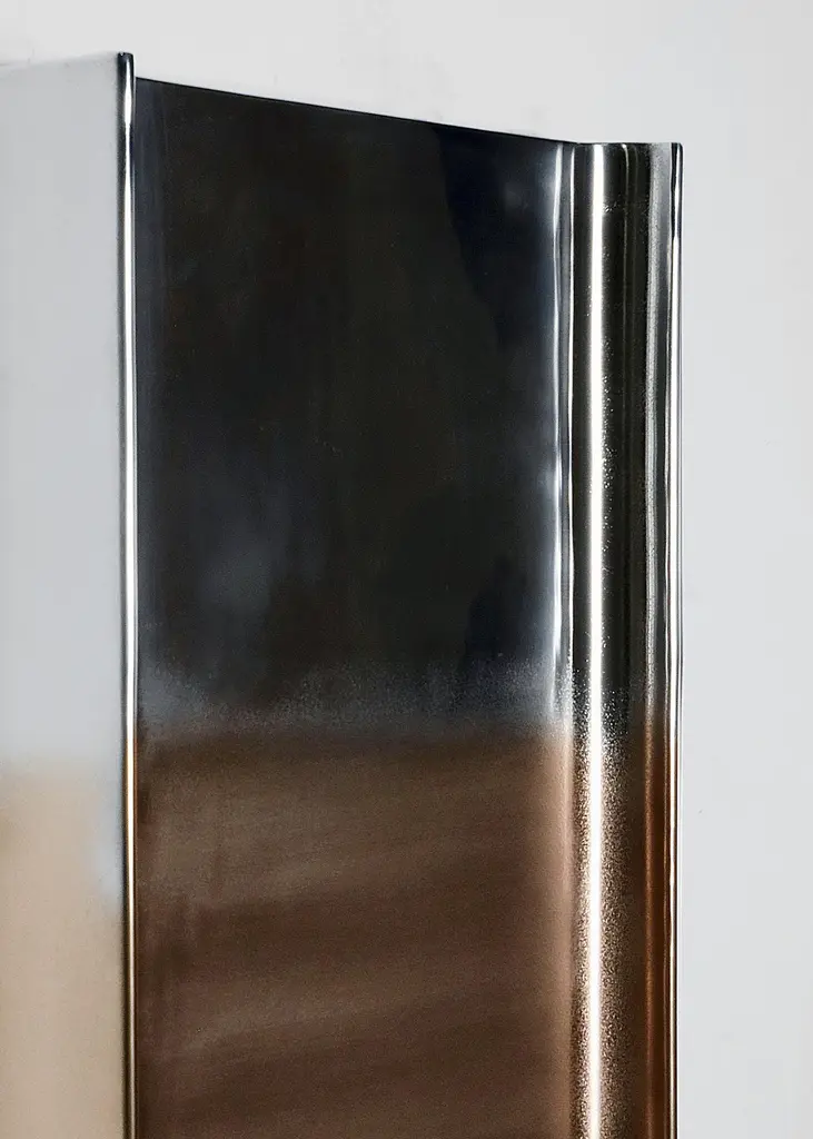 Marcin Rusak Studio’s Merging Metals collection focuses on showcasing the painterly qualities of merging metals, with the aim to instil artistic expression into the industrial processes associated with this material. The collection adopts a metal spraying technique traditionally used for large-scale industrial manufacture, and renders the process handmade, resulting in individually unique pieces. By applying metals such as bronze, brass, copper, zinc and aluminium to objects as if they were three-dimensional canvases, a truly original aesthetic landscape is created; one of deep colours and rich textures reminiscent of Minimalist sculpture and colour-field painting.Handmade in Europe, the MM Mirror 90-1 is made in steel and then covered in molten zinc and bronze. Its curved edges and irregular surface create a shiny, glamorous finish reminiscent of a Rothko painting.The piece will be shipped in a museum-quality wooden fumigated crate suitable for airfreight. The price includes packing and crating, and excludes shipping costs, import duties, and taxes, if applicable.