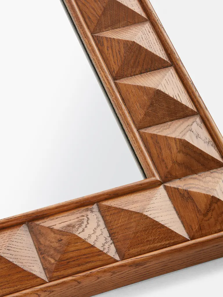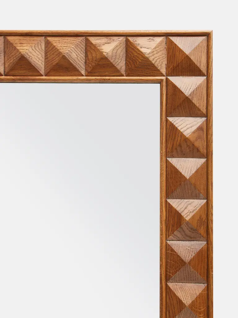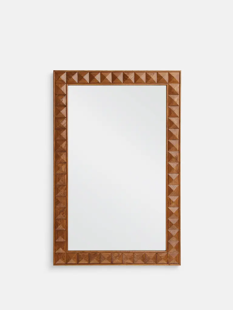 Our Marena mirror is characterised by an oak frame of textured square studs that catch the light at different angles. Inspired by White City House, this mirror can be hung in either orientation to bring a touch of Soho House design into your space. Large wooden mirror Solid oak frame Textured square stud detail Extension of the Marena furniture range Inspired by White City House