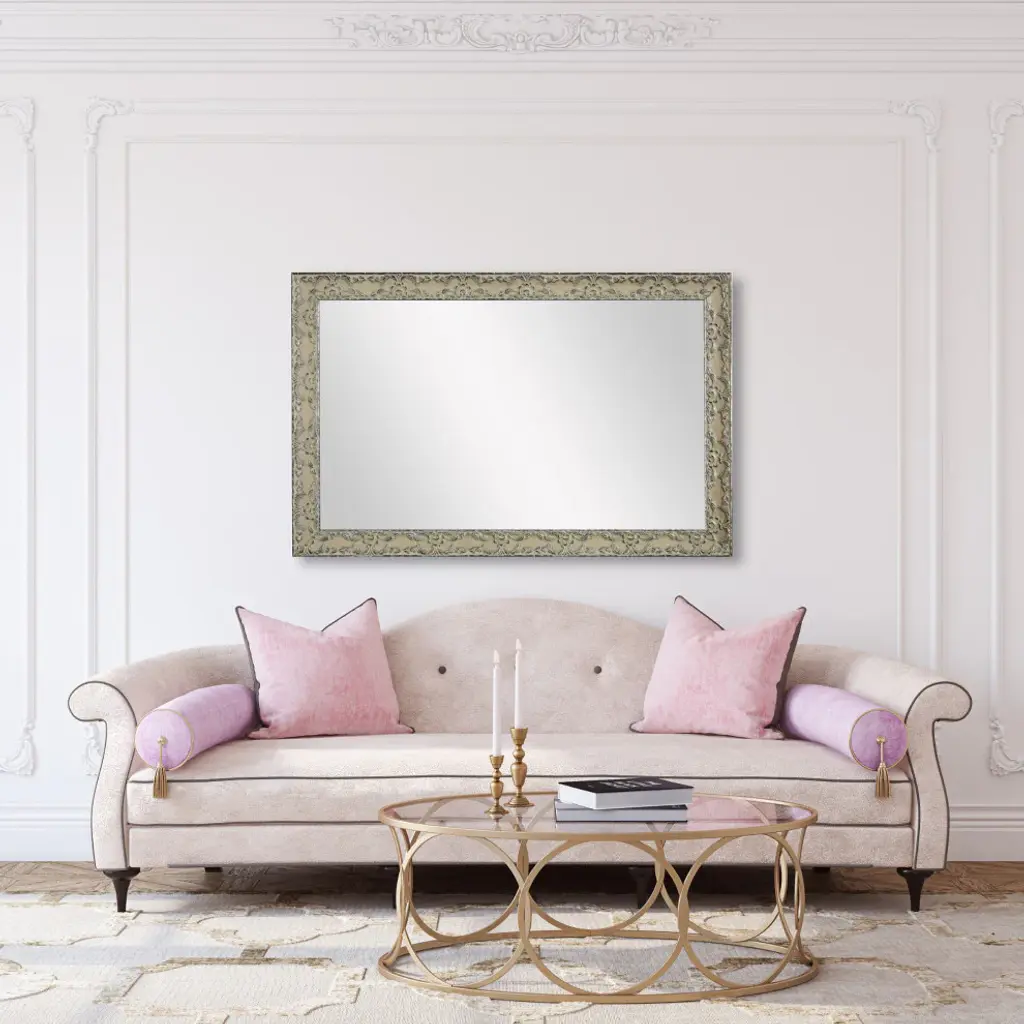 Delicate, raised designs grace the surface of the Maricopa, offering an ornate framed mirror option that maintains a feeling of simplicity. The buffed finish will give your custom mirror an antique look.Hangrail for installation will be applied on the width of the frame. All assembly hardware and instructions will be included. Additional hangrails are included if the opposite orientation is desired for installation. The dimensions displayed are the final outside dimensions of the frame, including the mirror. CATII safety backing applied on all mirrors. Approved for high-moisture areas such as bathrooms.
