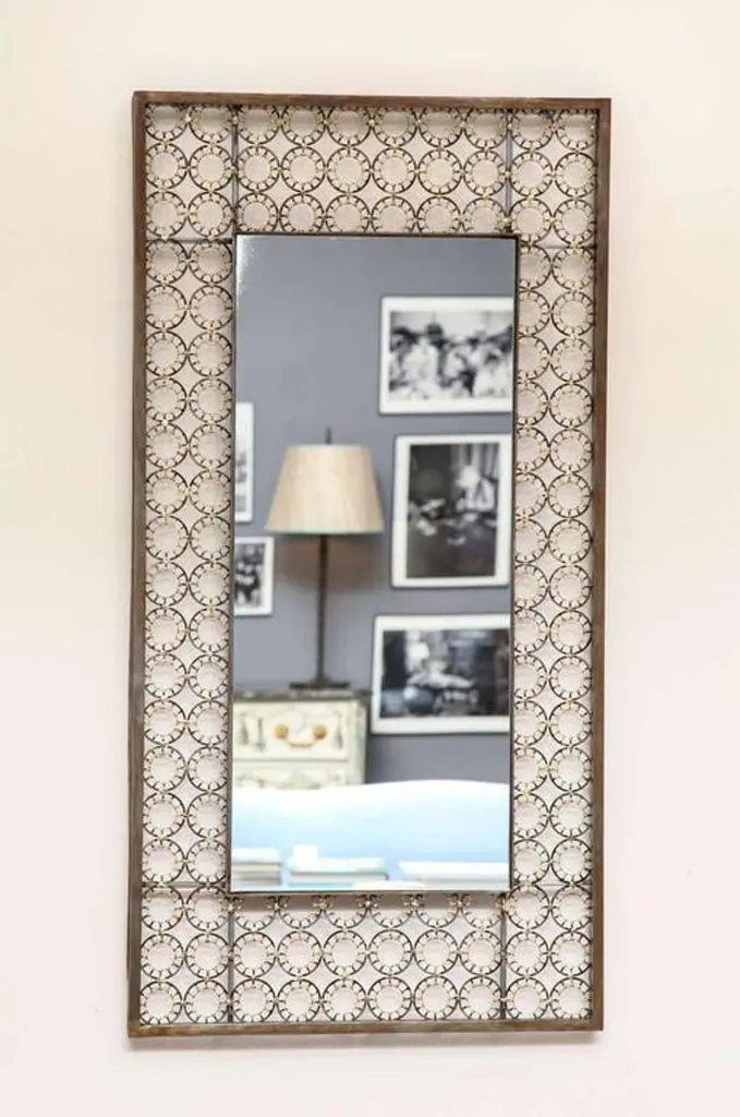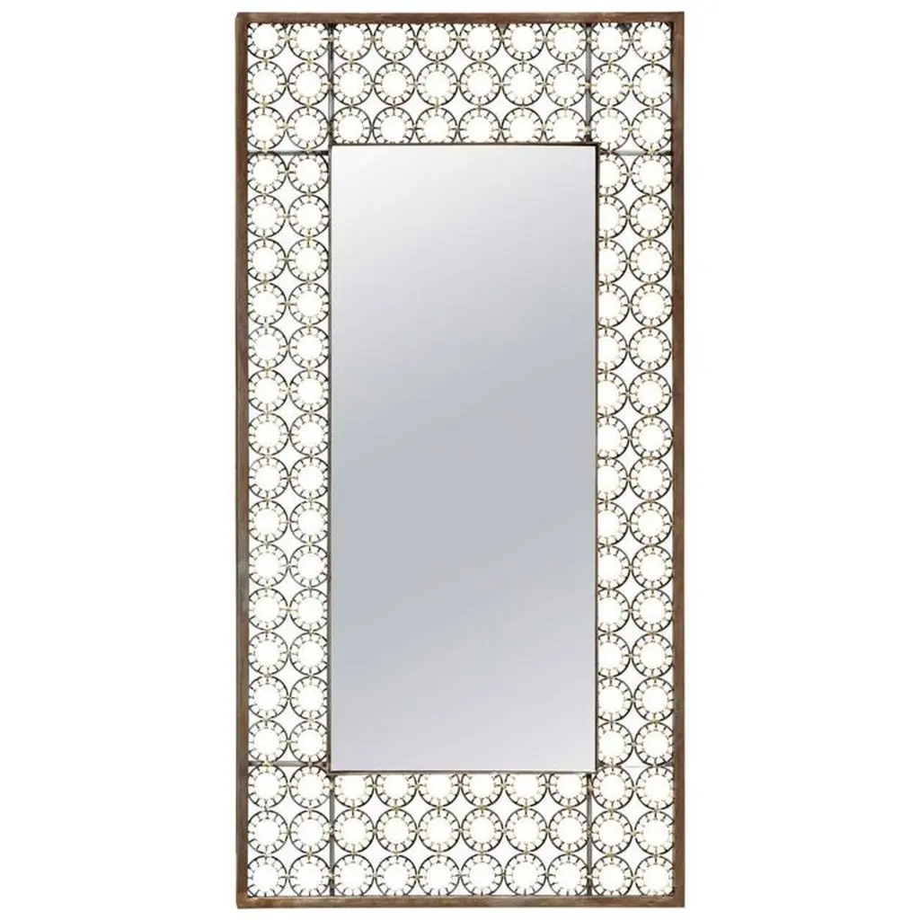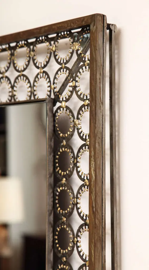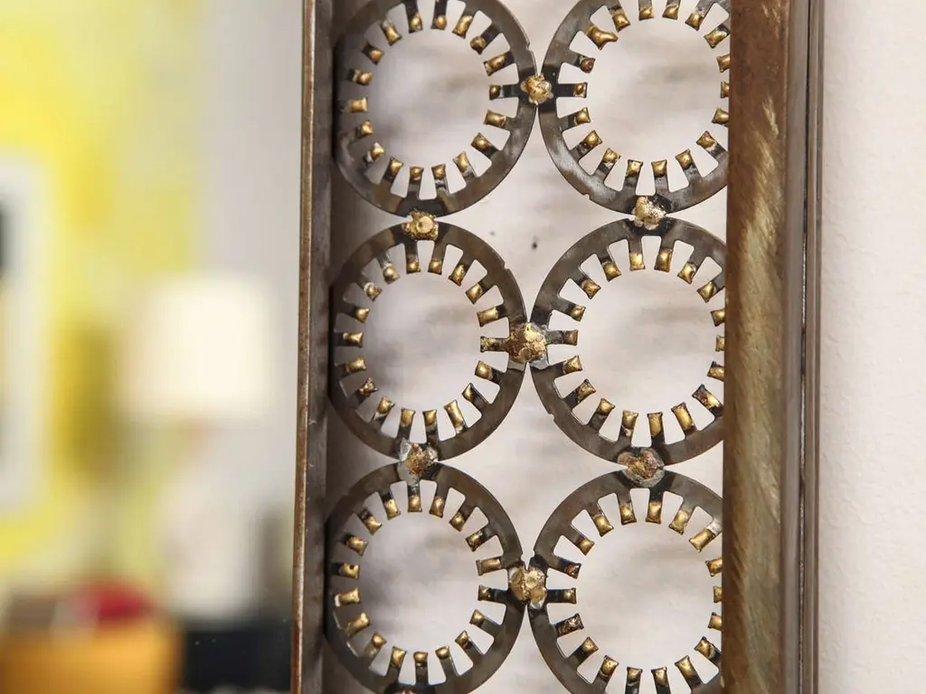 Marie SuriThe ovation mirrorRectangular wall mirror with steel medallions and bronze decoration in a patinated steel frame. Custom inquires welcome.Two frame options shown here:mitered corners with two rows all the way around: 38.25" H x 25.75" Wsquare corners with two rows on sides and three rows on top and bottom: 40.5" H x 20.75" W.
