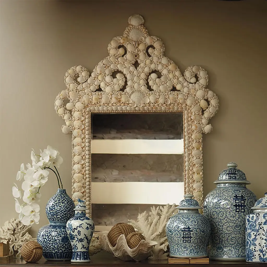 Like swirling water currents in the deep blue sea, overlapping shells create gentle waves that frame the grand and uncommon Marigot Shell Wall Mirror. Authentic sun-bleached clam, winkle and scallop shells of various sizes are hand applied to the distinctive pediment and base for an easy coastal vibe every time you gaze in the mirror. Beautifully adorned with various sizes of genuine clam, winkle and scallop sea shells Each authentic shell is hand-arranged and hand-applied Pediment design is scrolling swirl of overlapping clamshells, capped with one large native scallop shell Base features layered clamshells flowing out from a center scallop shell At Frontgate, our primary focus is quality. We guarantee that every product we sell will stand up to the supreme test – our customers' satisfaction. To learn more about our policies, visit our Shipping & Processing, Returns & Exchanges and Warranty & Price Guarantee pages.