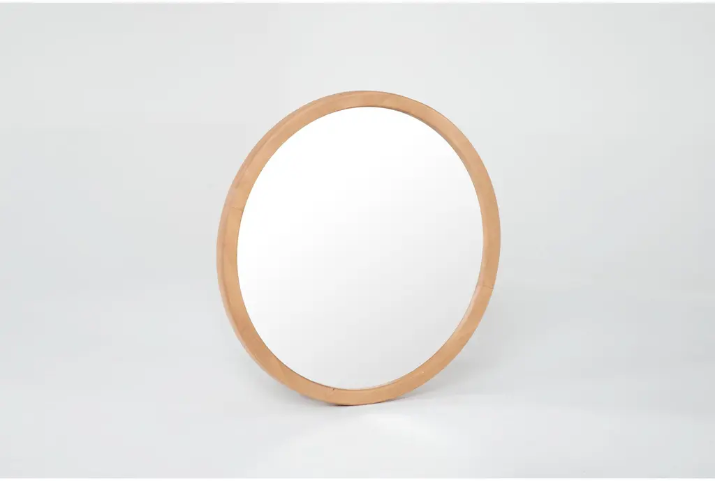 Enhance your bedroom with the Mariko Natural Wood Round Mirror. Designed in a modern style, this mirror features a wheaten color that complements its ash veneer and solid birch composition. Its round shape adds a touch of contemporary charm to your space.
