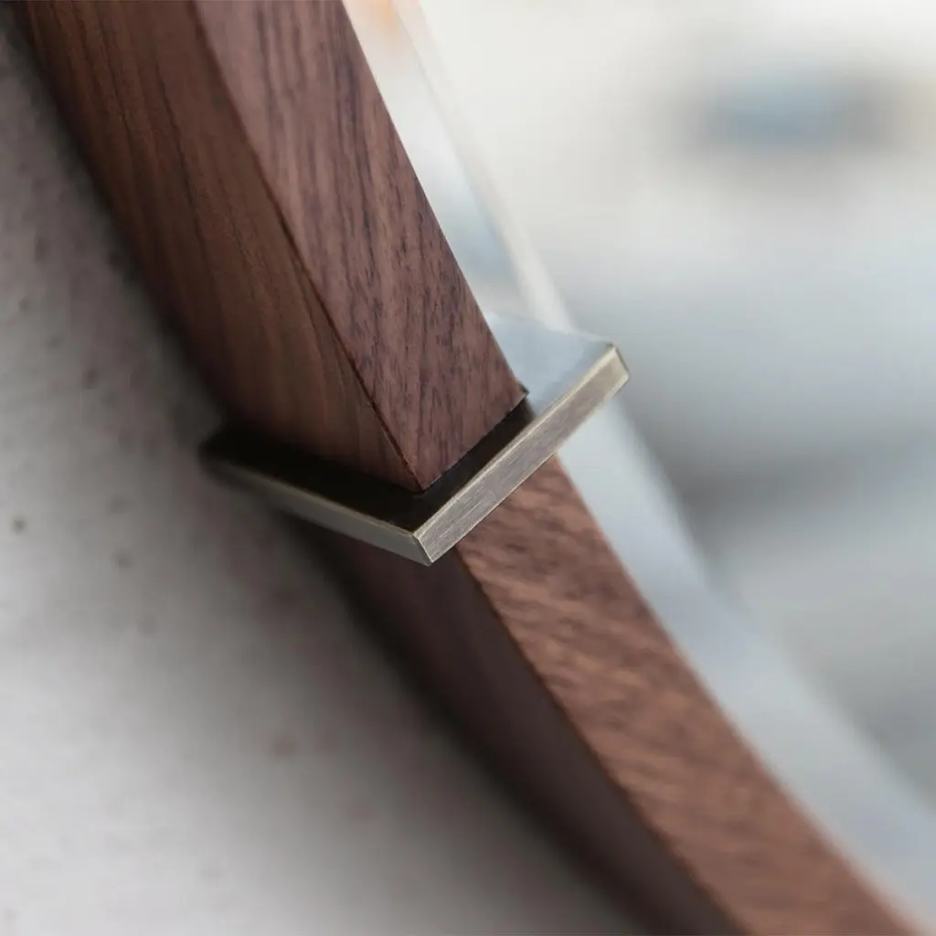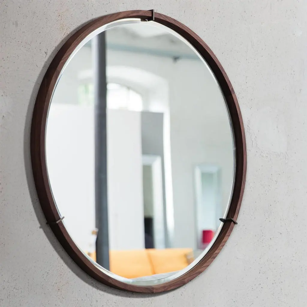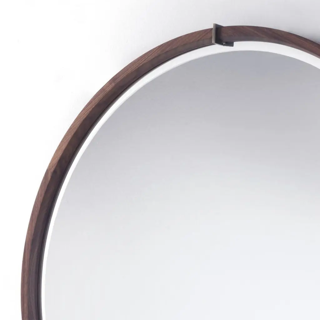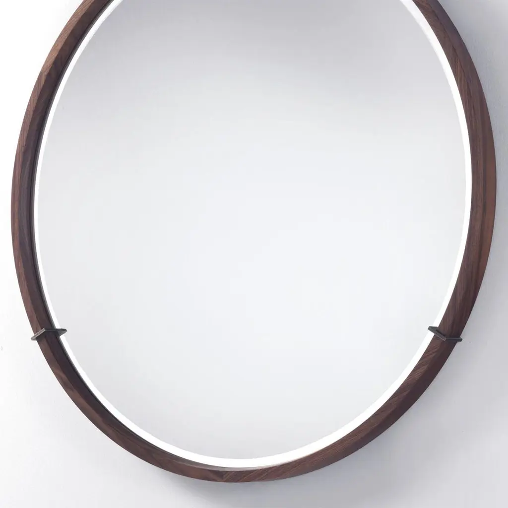 Mirror Mark Round with solid walnut wood round framewith 3 brushed bronzed solid brass inserts. With roundbevelled mirror glass.