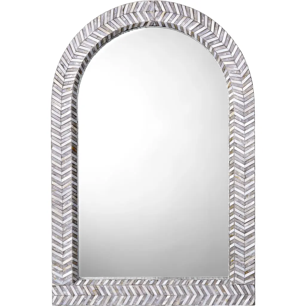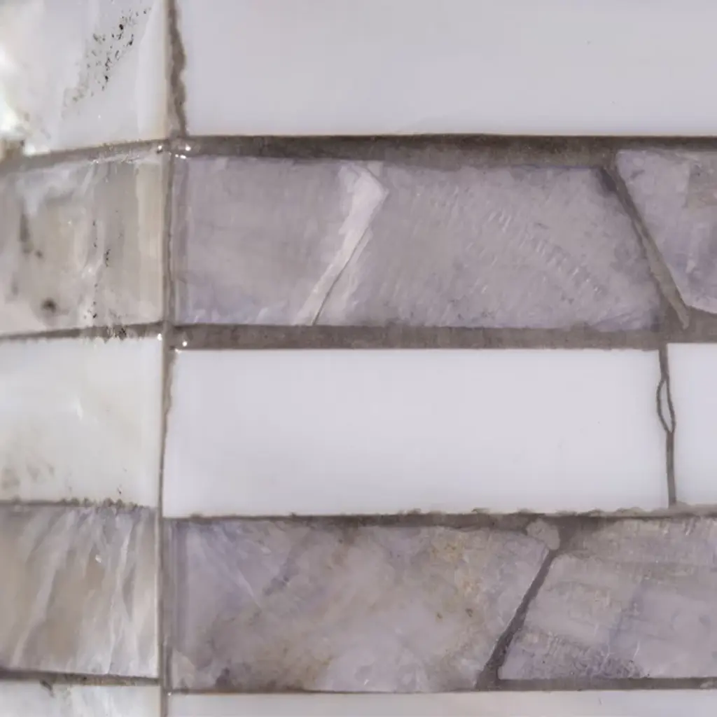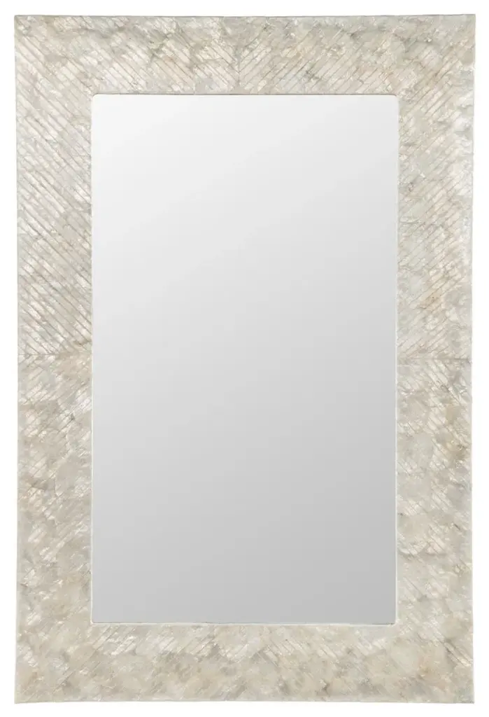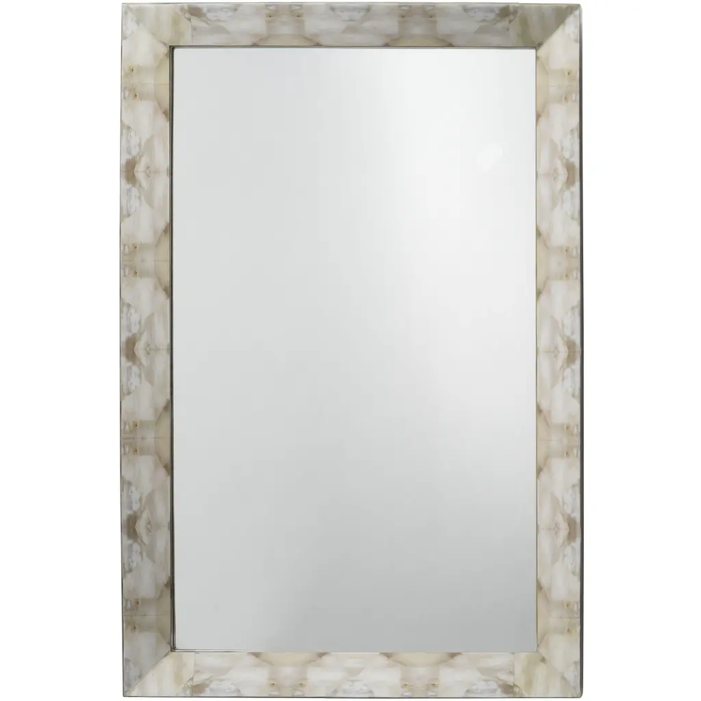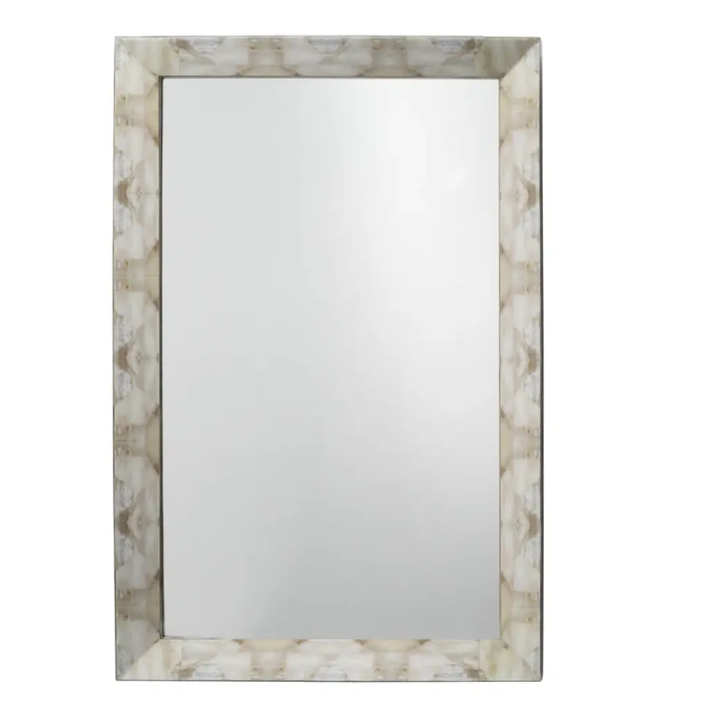 The Marmont Rectangle Mirror from Jamie Young Co. showcases the natural artistry of mother of pearl through scrupulous craftsmanship. Artisans carefully arrange small strips of this oceanic material to create a mosaic frame that captures and reflects light in constantly changing patterns. The natural iridescence of the material creates subtle depth and movement around the non-beveled mirror. The rectangular format provides versatile hanging options, working equally well in portrait or landscape orientation.
