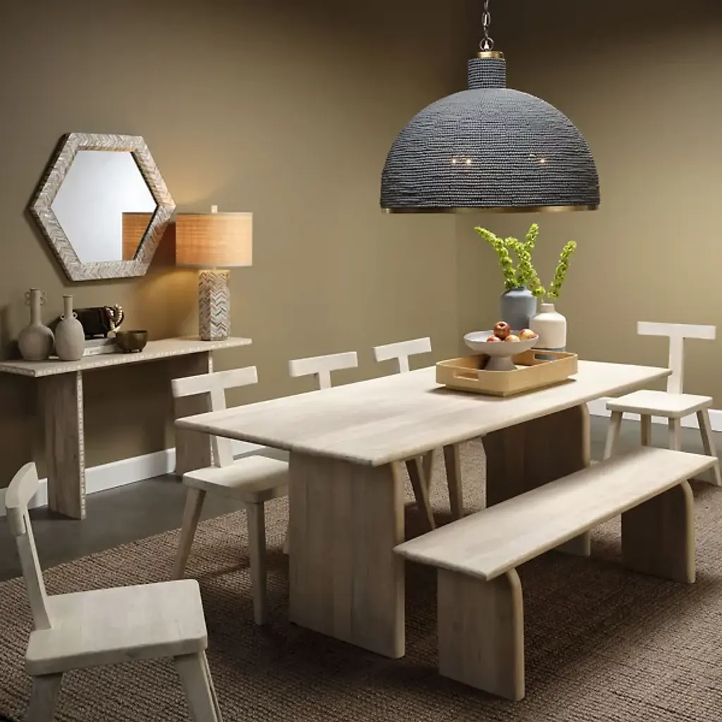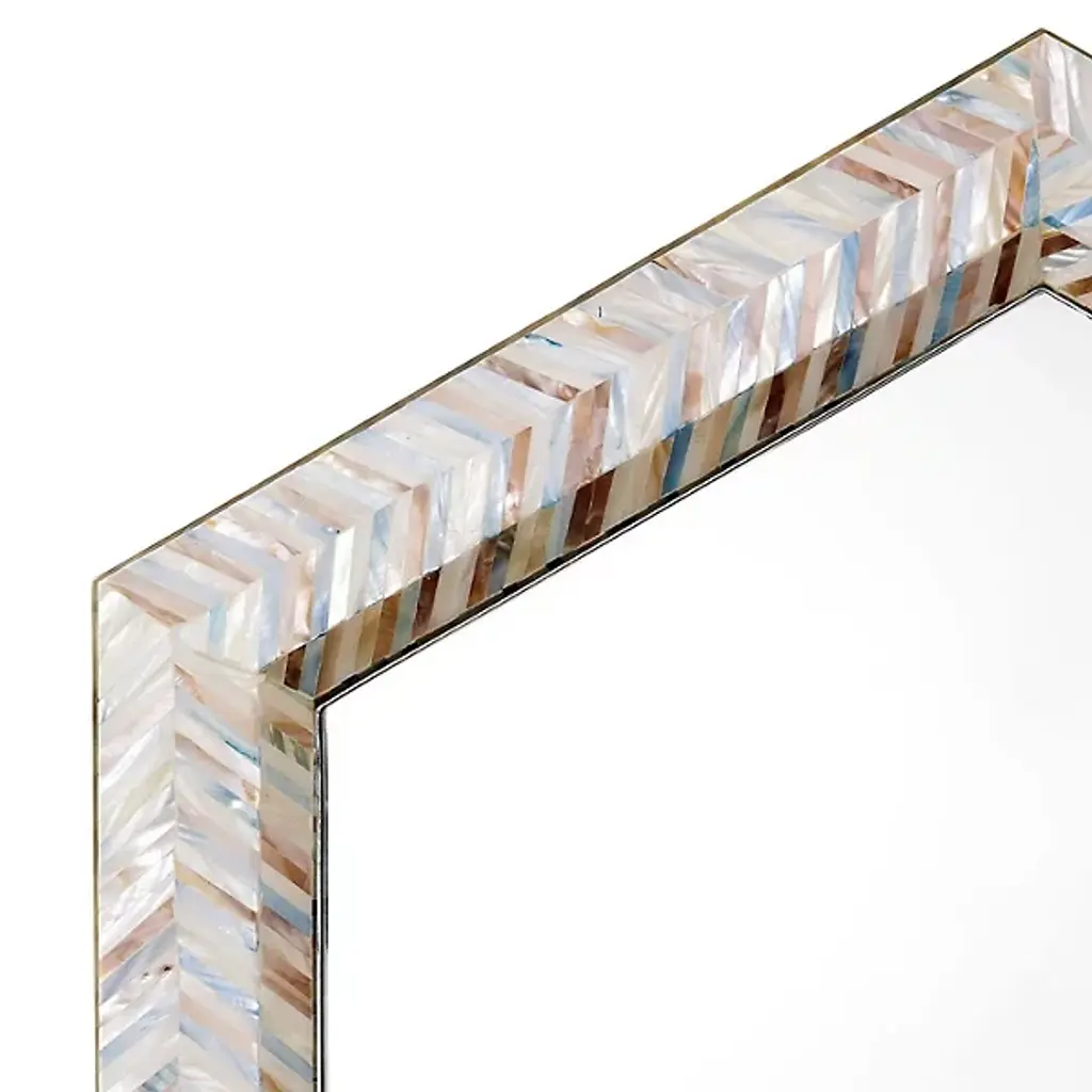 The Academy Marmont Rectangle Mirror from Jamie Young Co. breaks from traditional mirror shapes with its bold hexagonal design. The frame features precisely arranged mother-of-pearl strips that create dynamic patterns through their natural iridescence. Each piece is individually placed by master artisans, resulting in a uniquely detailed mosaic that surrounds the non-beveled glass. Its distinctive shape works particularly well in modern spaces seeking to incorporate organic materials with a structured design.