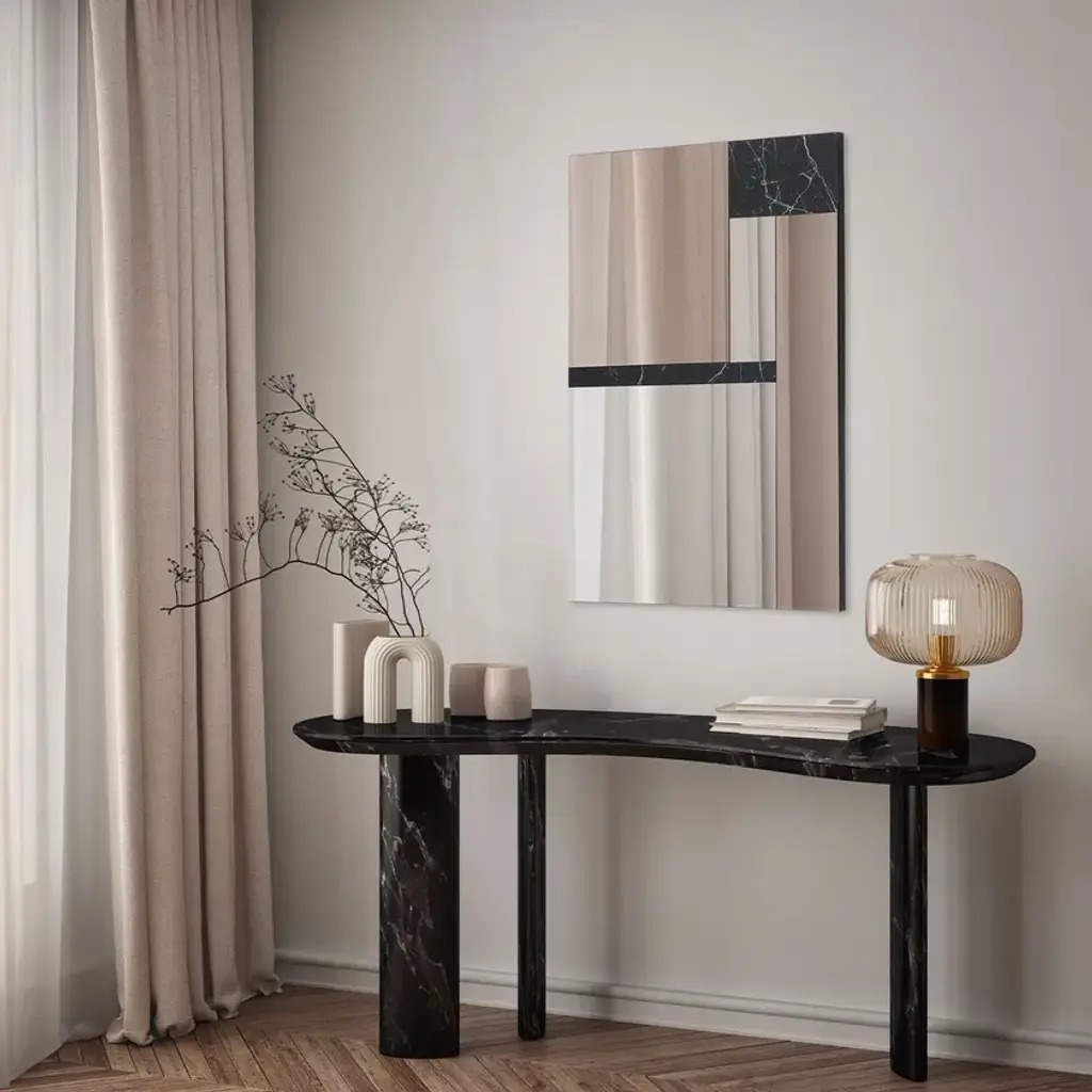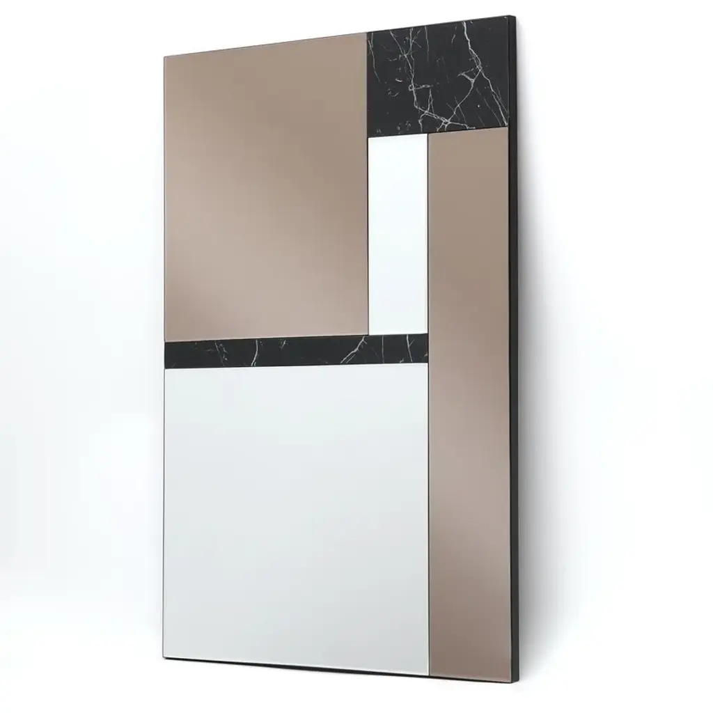 Marquinia 2 is a decorative mirror with an innovative design. Its elegant linear structure offers a double reflection experience thanks to its fully reflective silver and burnished sections. The black marble finish detailing completes the luxurious aesthetics of this mirror. It can be positioned either vertically or horizontally, making it a versatile and ideal choice for customising any setting according to the specific needs of the space.The AGAVE Art Mirrors collection was born from the desire to merge the art of painting with the functionality of mirrors into a unique and innovative piece of furniture: the Art Mirror. Launched in 2024 to celebrate the 15th anniversary of the AGAVE brand, this collection celebrates the excellence of contemporary art in interior design. These unique mirrors transform spaces into elegant and characteristic environments, perfect for design projects that require a distinctive touch. Discover how the AGAVE collection can enrich and enhance your projects with style and sophistication.