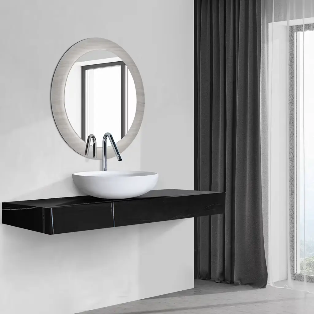 Backlit mirror with porcelain tiles. Available in different colours of porcelain tiles marble effect. Here's a Travertino effect.