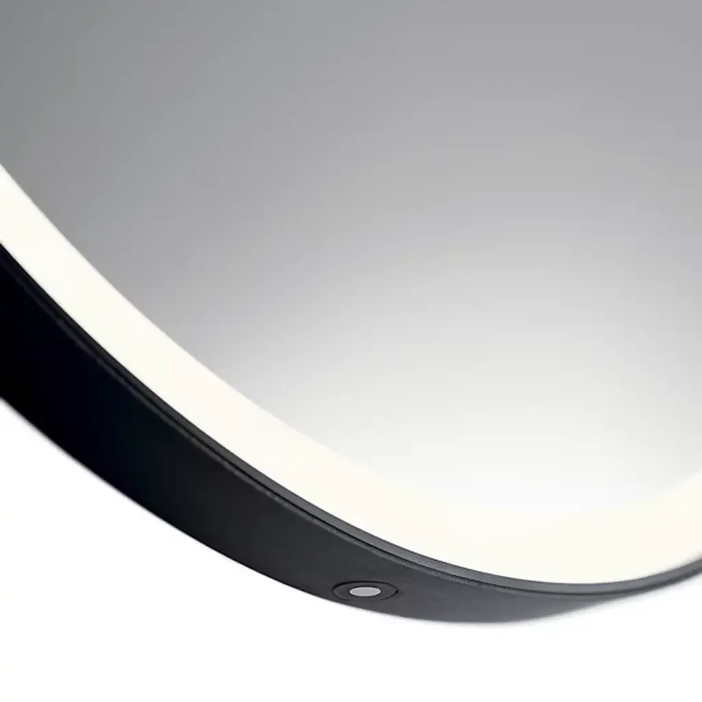Hang the radiant sun inside with the abstract, appealing form of the Martell LED Mirror from Elan Lighting. A short horizontal peg and faux-leather strap suspend a round reflector with a European circular style. The mirror is ringed by LED lamping, contrasting a matte frame with the sleek mirror inside, activated and operated with a touch dimmer and color temperature setting allowing an individual and adaptable light.