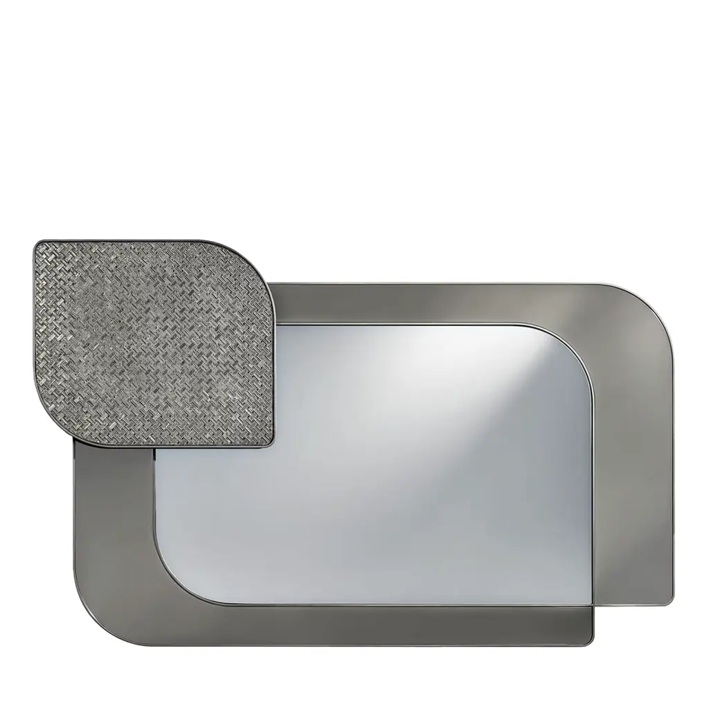 Wood wall mirror with lacquered finishes and metallic finish inserts.