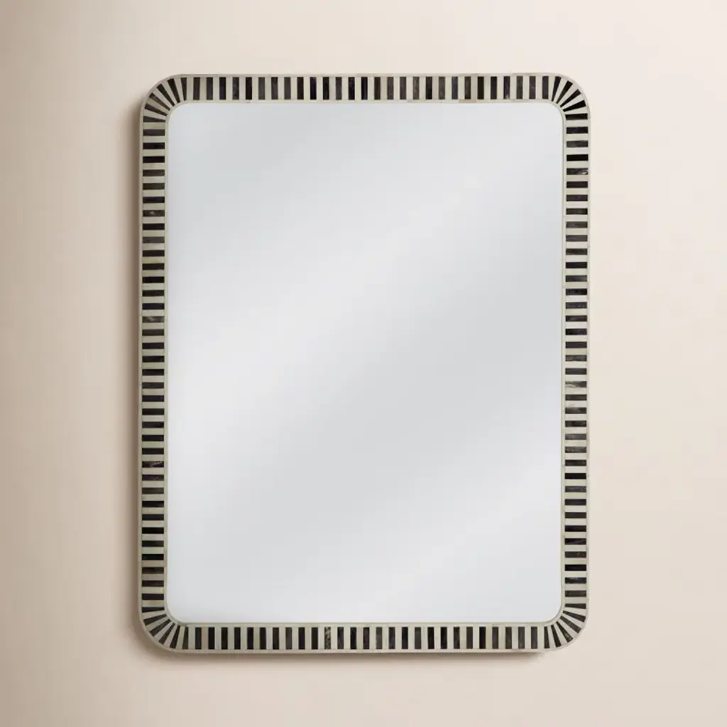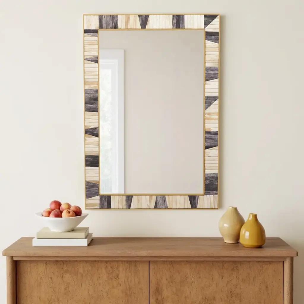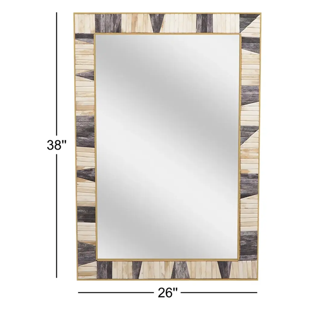 Bring the charm of modern farmhouse style to your home with this hand-painted, rectangular accent mirror. Its unique blend of brass, bone, and resin creates a frame that's both eye-catching and versatile. This mirror is perfect for adding a touch of rustic elegance to any room.