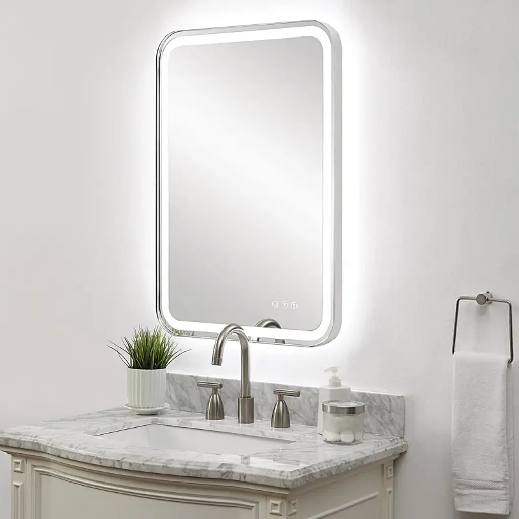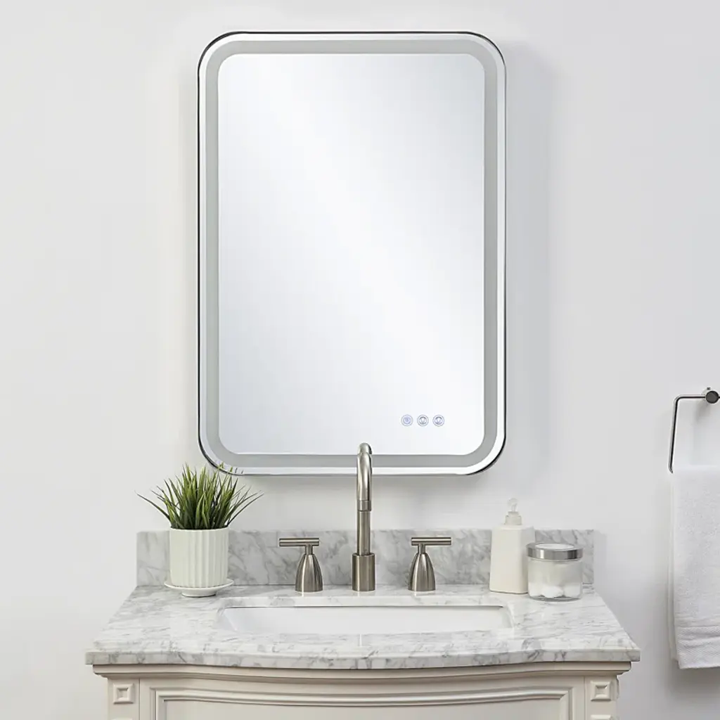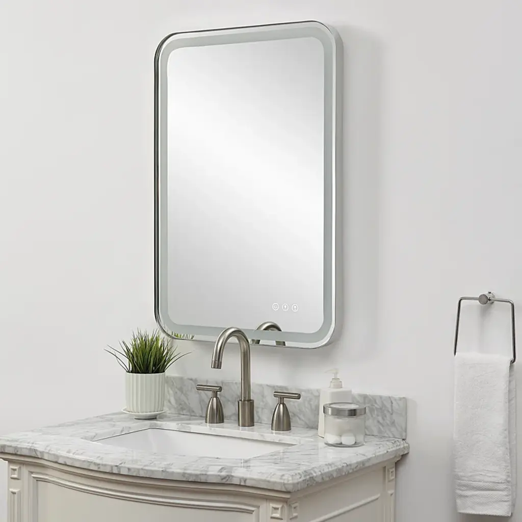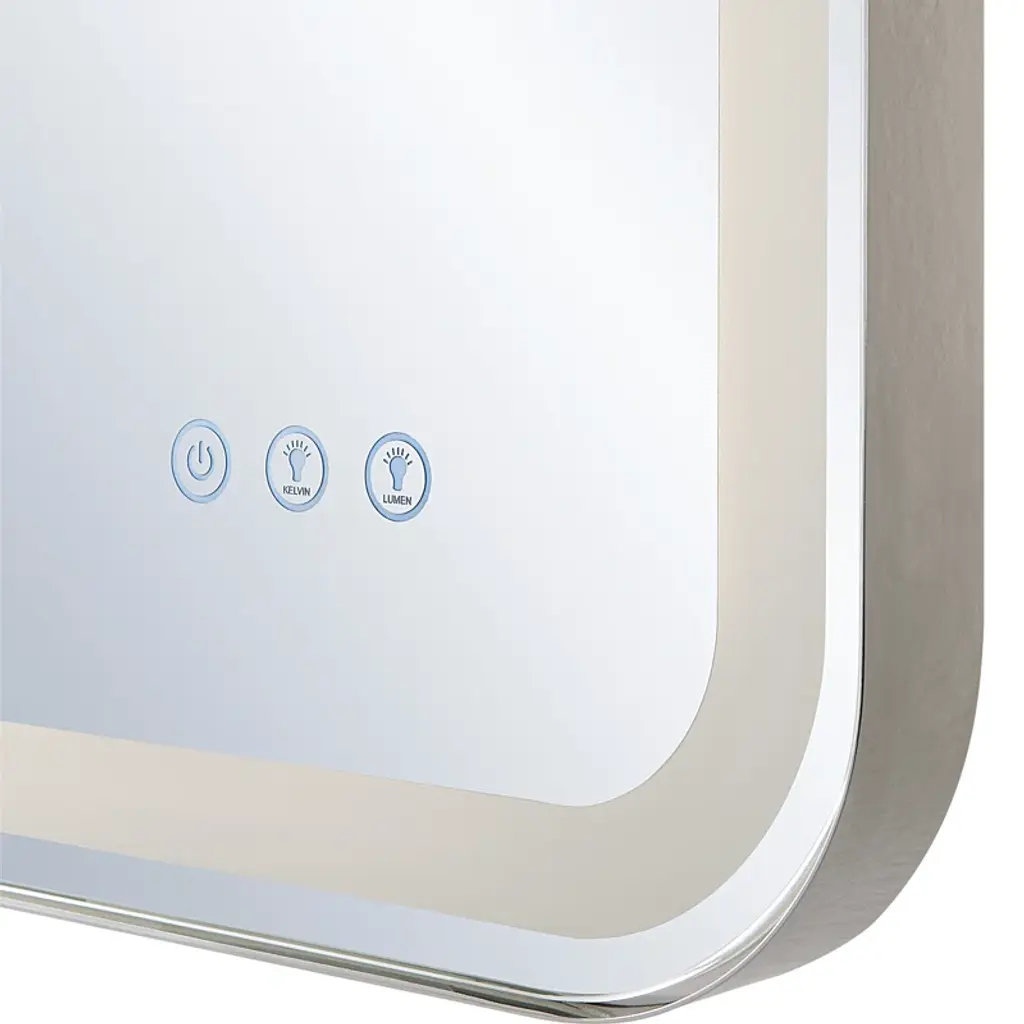 Versatile In Design, This Vanity Mirror Has Integrated LED Lighting That Illuminates Through The Frosted Strip In The Polished Edged Mirror. The Polished Nickel Plated Stainless Steel Frame Is Off Set From The Wall To Allow Ambient Lighting From The Back. Easy To Use Touch Buttons Are Featured On The Bottom Right Of The Mirror With An On Off Function, Touch And Hold Kelvin Control From 2700k To 4000k, And Touch And Hold Brightness Control. LED Lights Rated At 40,000 Hours. Ships With Plug, But Can Be Hardwired Professionally. Touch Screen Icons Continue To Illuminate When Powered Off For Easy Navigation In Dark Settings.