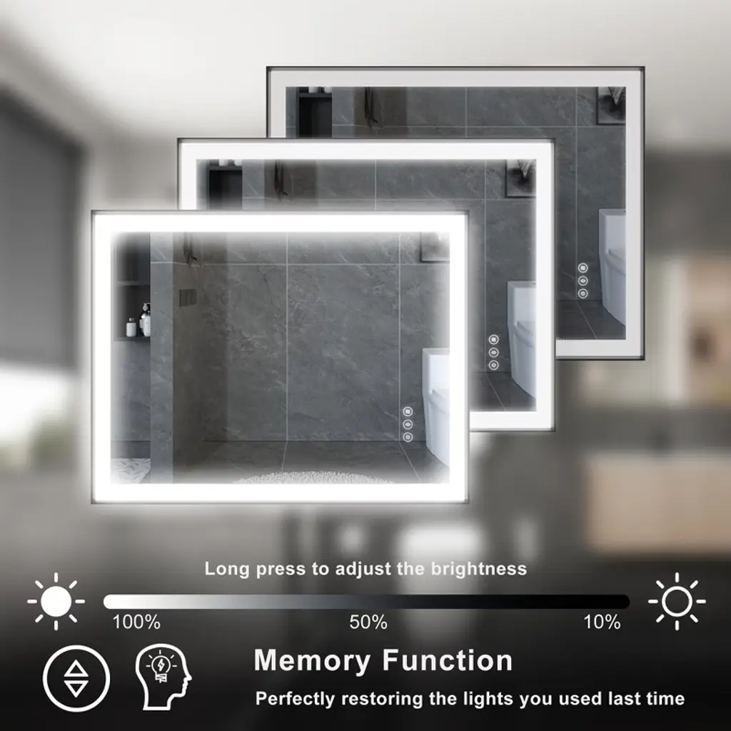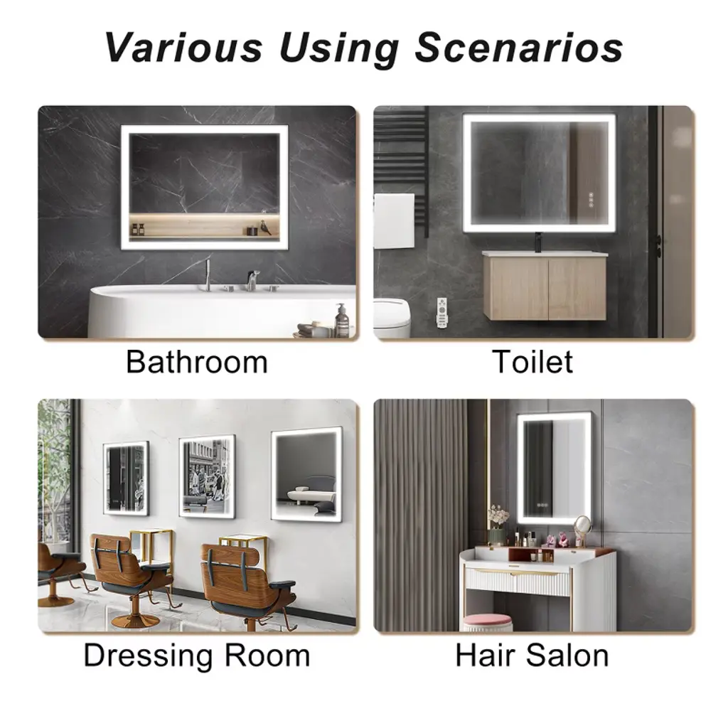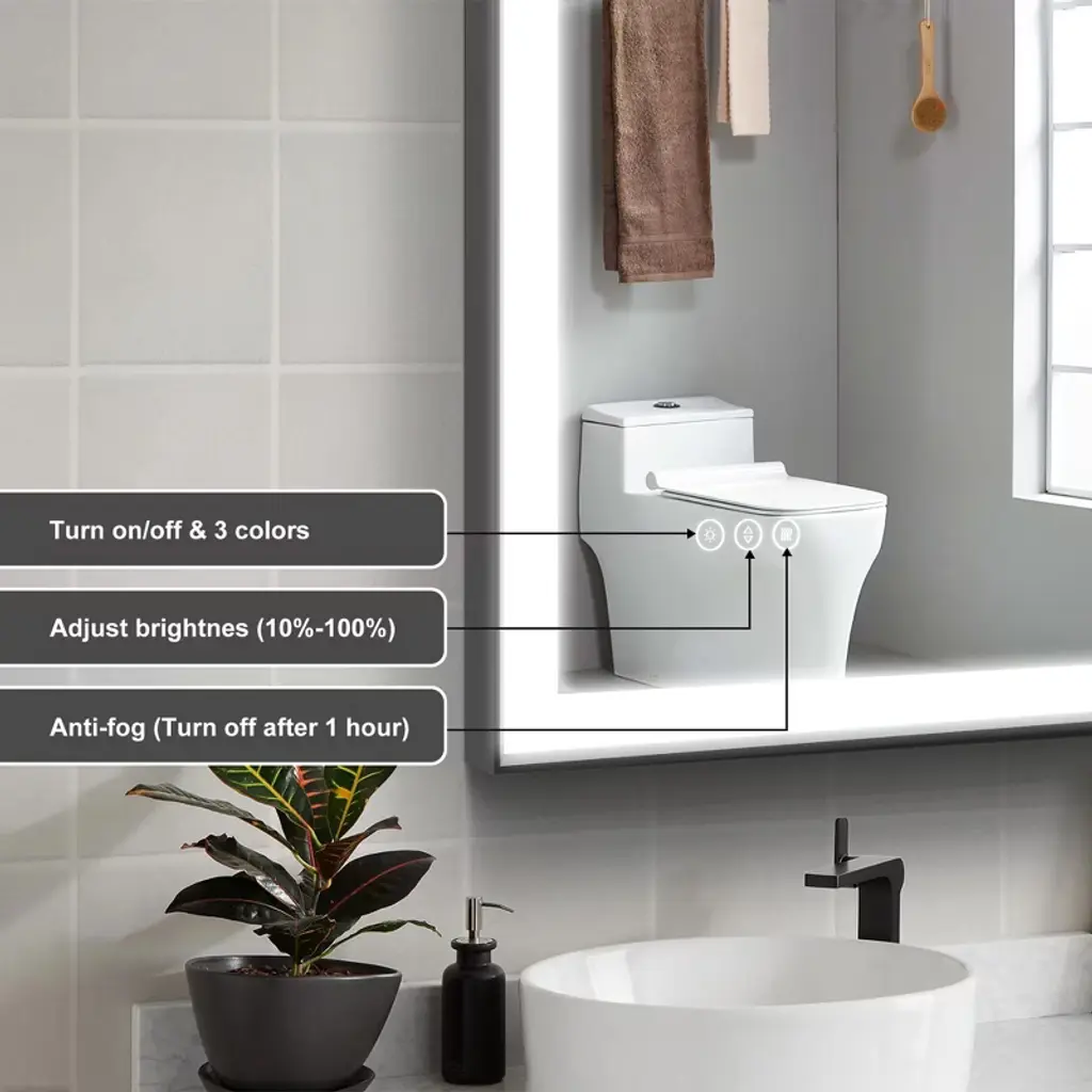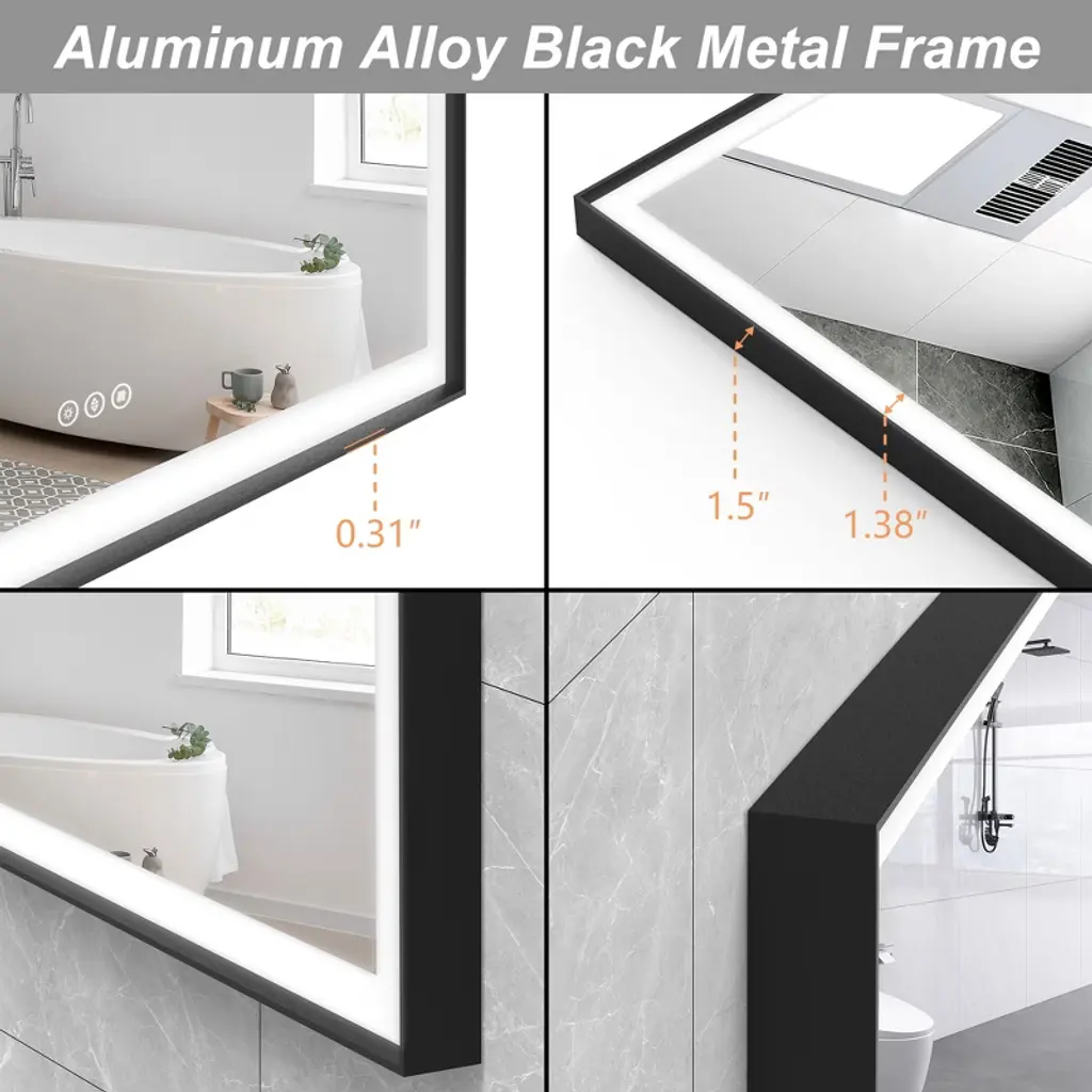 Sleek Aluminum Frame: Crafted with a modern aluminum frame, this mirror boasts a stylish and sturdy construction that enhances the look of any bathroom. The aluminum frame adds a contemporary touch while providing durability and long-lasting performance. LED Lighted for Superior Illumination: Equipped with energy-efficient, built-in LED lights, this mirror offers optimal brightness for grooming, makeup application, or simply enhancing your bathroom atmosphere. The LEDs provide consistent, bright lighting with minimal energy consumption, making it both eco-friendly and cost-effective. Dimmable Touch Control: Adjust the lighting to your preferred brightness level with the intuitive touch control feature. Whether you need a soft, ambient glow or bright, focused light for precise tasks, the dimmable control ensures the perfect level of illumination for every occasion. Anti-Fog Technology: No more wiping your mirror after a hot shower! The built-in anti-fog feature ensures that the mirror stays clear and fog-free, even in steamy conditions, providing you with a pristine reflection every time. Tempered Glass for Enhanced Safety: The high-quality tempered glass is not only resistant to heat and humidity but also ensures durability and safety. It provides a smooth, clear reflection and can withstand everyday bathroom conditions.