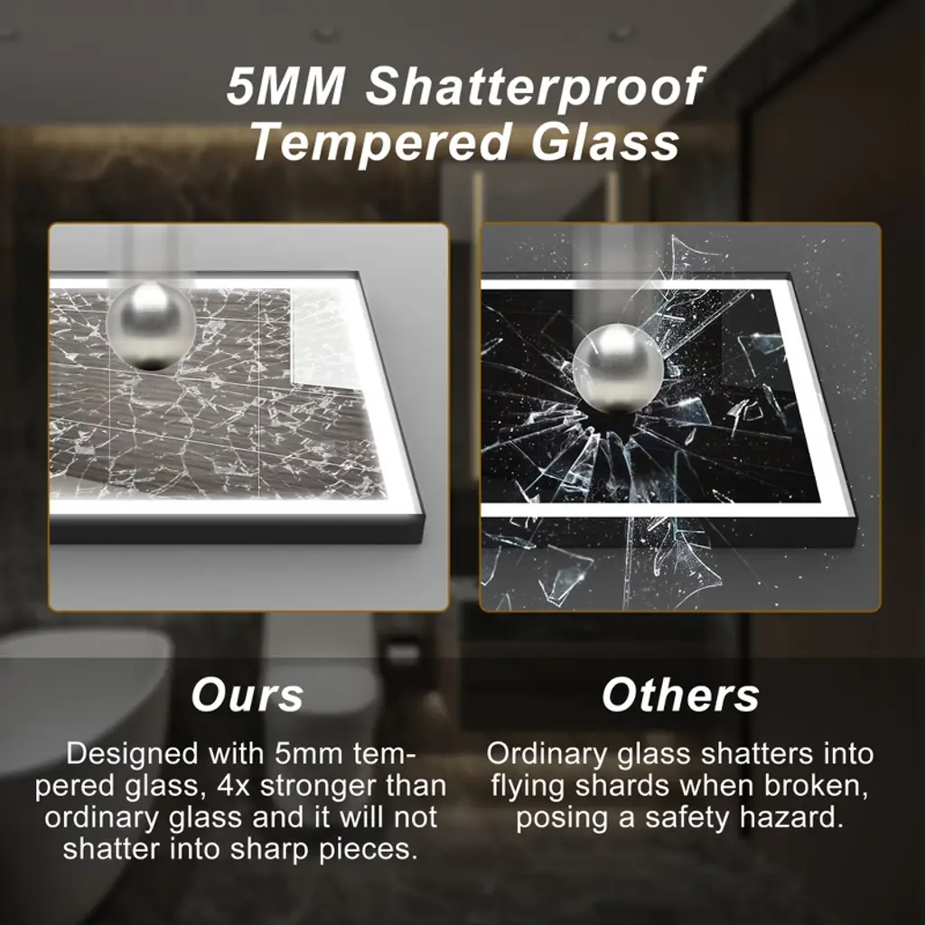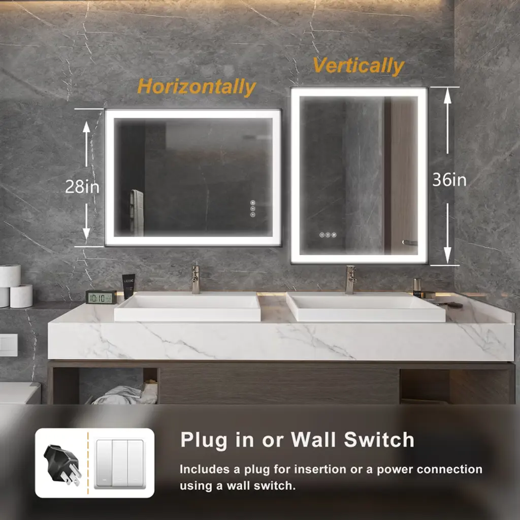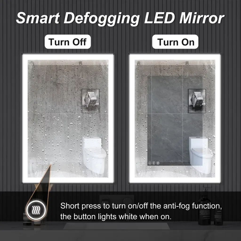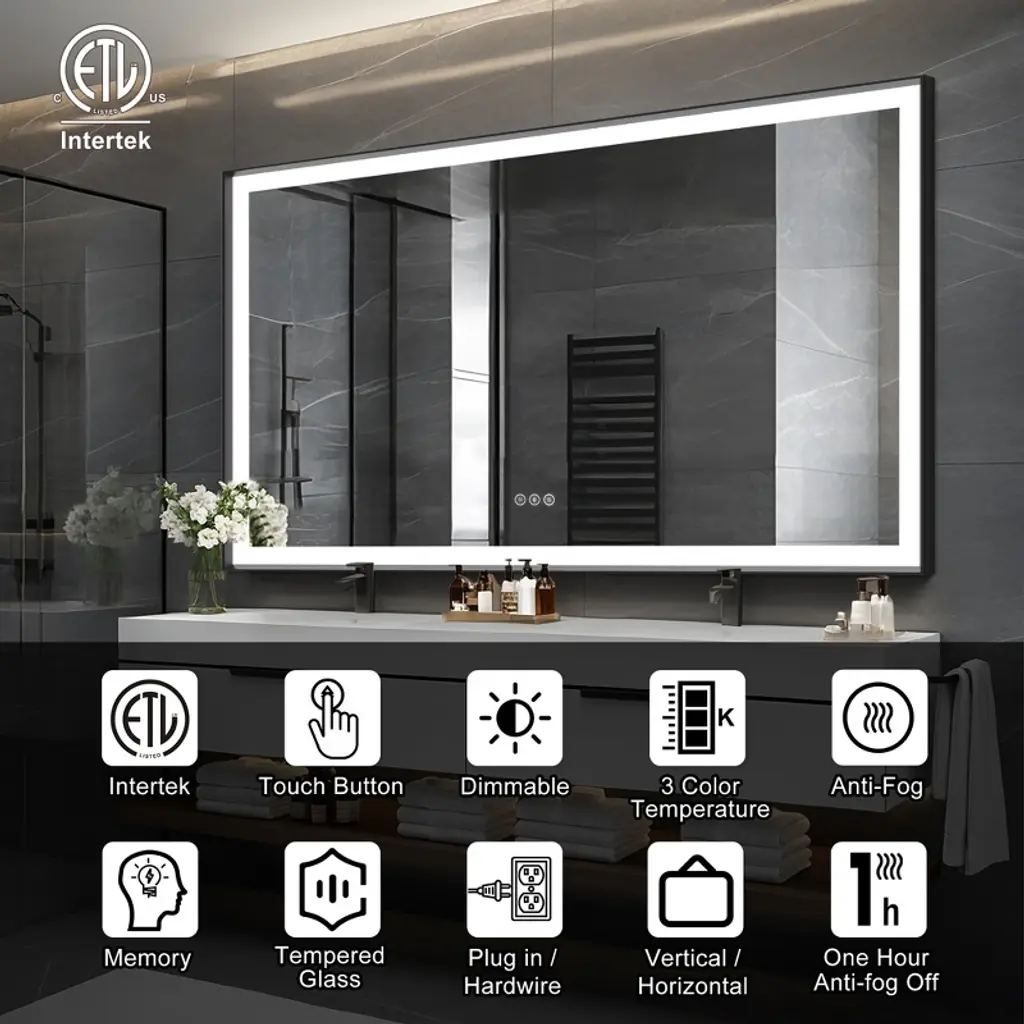Sleek Aluminum Frame: Crafted with a modern aluminum frame, this mirror boasts a stylish and sturdy construction that enhances the look of any bathroom. The aluminum frame adds a contemporary touch while providing durability and long-lasting performance. LED Lighted for Superior Illumination: Equipped with energy-efficient, built-in LED lights, this mirror offers optimal brightness for grooming, makeup application, or simply enhancing your bathroom atmosphere. The LEDs provide consistent, bright lighting with minimal energy consumption, making it both eco-friendly and cost-effective. Dimmable Touch Control: Adjust the lighting to your preferred brightness level with the intuitive touch control feature. Whether you need a soft, ambient glow or bright, focused light for precise tasks, the dimmable control ensures the perfect level of illumination for every occasion. Anti-Fog Technology: No more wiping your mirror after a hot shower! The built-in anti-fog feature ensures that the mirror stays clear and fog-free, even in steamy conditions, providing you with a pristine reflection every time. Tempered Glass for Enhanced Safety: The high-quality tempered glass is not only resistant to heat and humidity but also ensures durability and safety. It provides a smooth, clear reflection and can withstand everyday bathroom conditions.