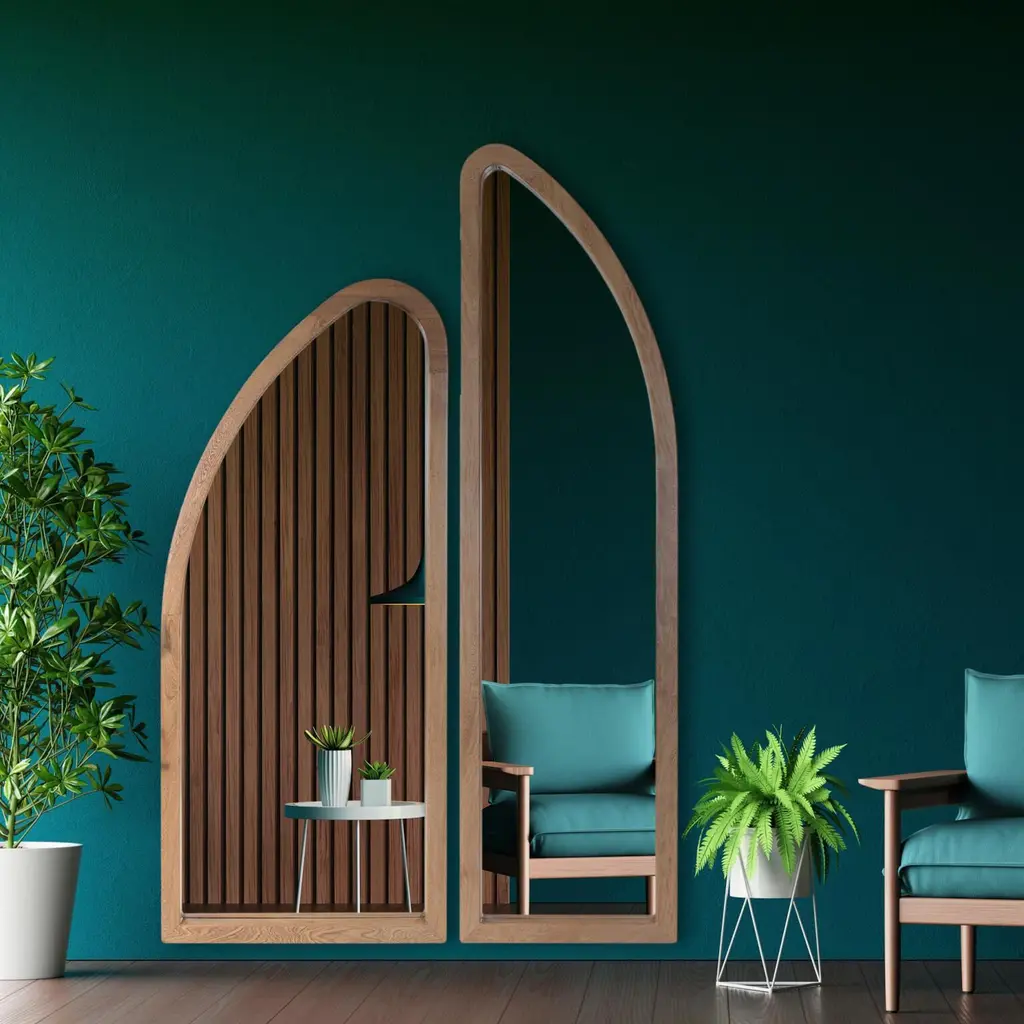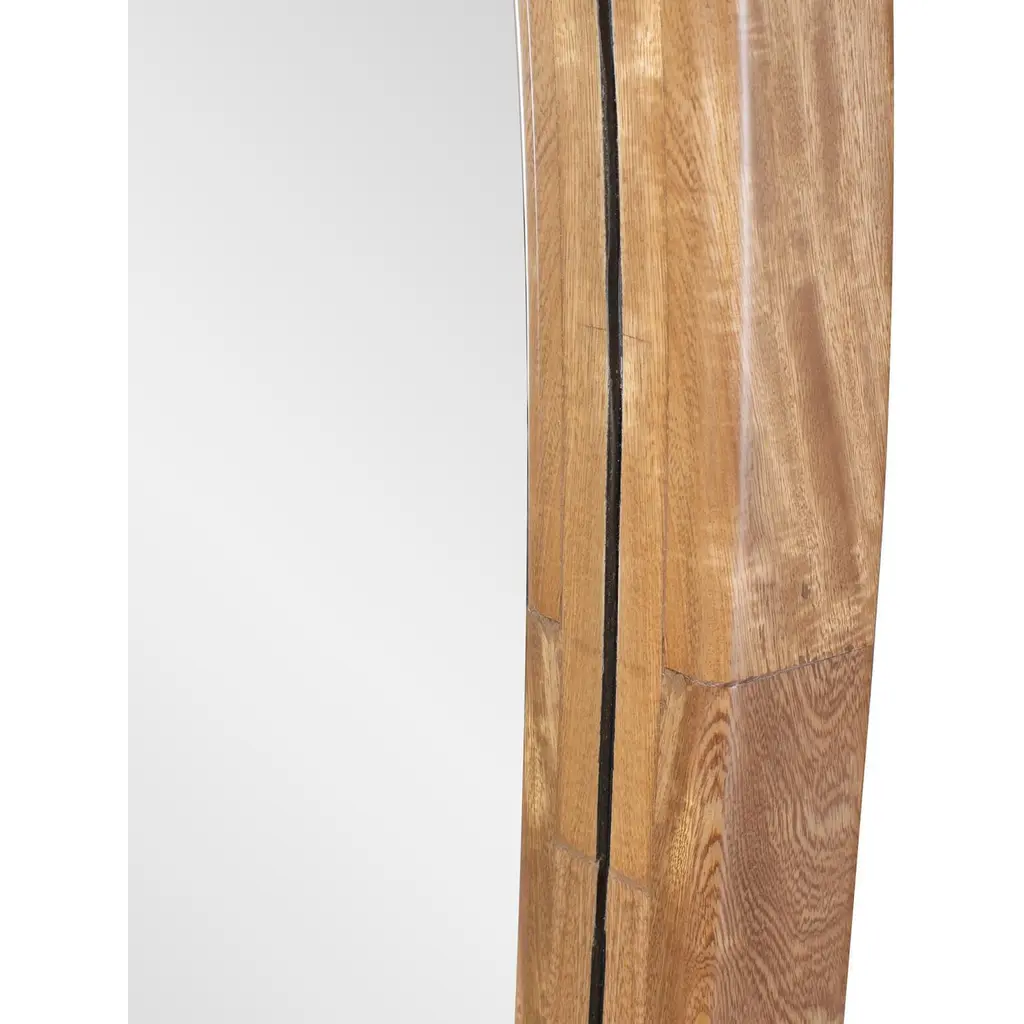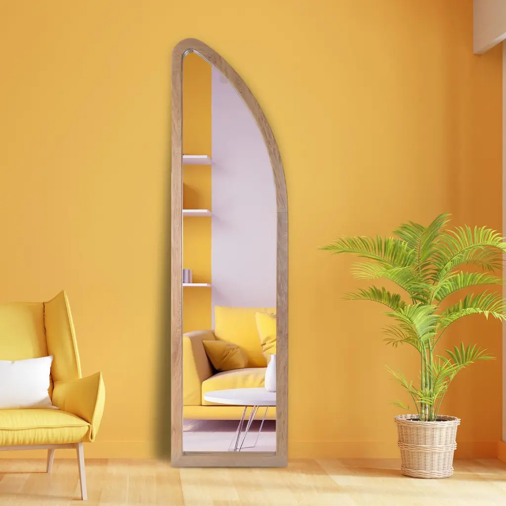 Crafted with an asymmetrical design, this wooden mirror boasts a distinctive character. Whether hung on the wall or utilized as a leaner mirror, its wood grain texture and sleek finish add a touch of natural elements to your space.