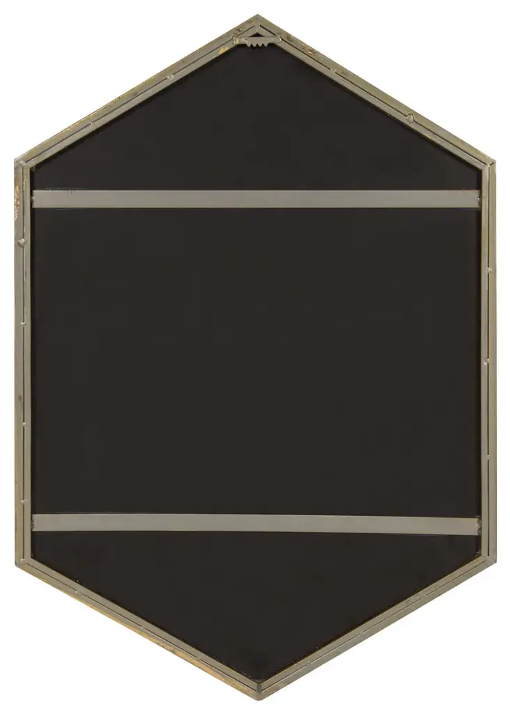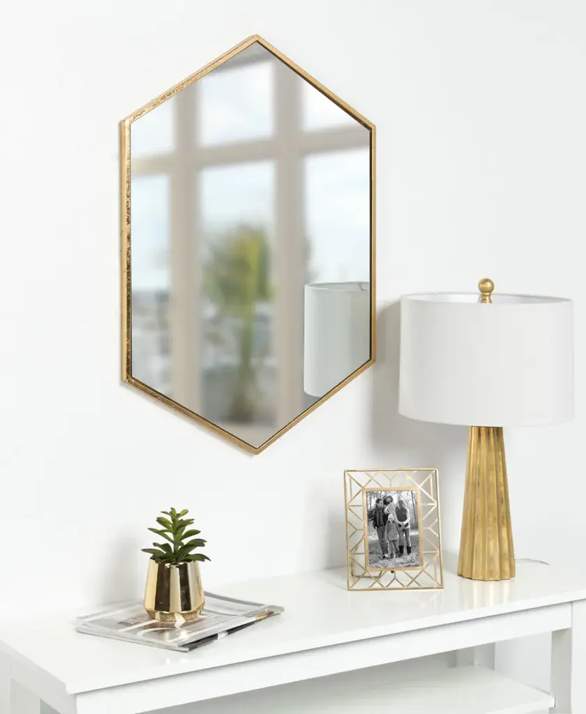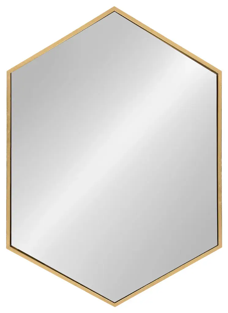 A large, uniquely shaped mirror is the type of home accessory that performs without any fuss. The shape along with the antique gold trim and the ample surface space of the mirror itself makes the Kate and Laurel McNeer Mirror, not just an accessory but a showpiece. Use it in a bathroom for a functional decorative effect over a vanity or as an impressive piece of wall art. It works in many spaces. Hang it in an entrance hall, over a bench or couch, in the dining room, etc. A well-placed mirror creates harmony and pulls a place together as it reflects the space. The dimensions are 31 inches tall by 21.75 inches wide.• VERSATILE SHAPE: The clean-lined visual silhouette of this hexagon wall mirror brings about pure visual appeal. With an outside frame size of 31 x 22 inches, the shape and size of the McNeer Mirror is perfect to put over a dresser or any piece of furniture you want to enhance• DECORATIVE ACCENT: An artistic display on its own, this mirror is a beautiful part of any home decorating scheme. The gilt frame adorns the mirror that has been slightly sunken in giving the illusion of even more depth• EASY HANGING: This mirror is meant to hang vertically. The sawtooth hanger hardware has been securely welded to the top and allows for an easy installation• VISUAL STYLE: An attractively framed mirror is the affordable way to decorate your wall while bringing light and space into a room• EASY WALL ART: This decorative mirror is both functional and beautifully crafted