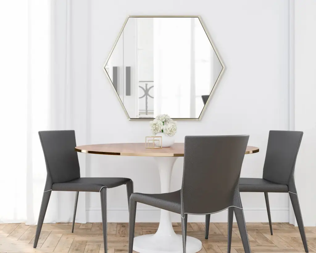 An avant-garde and geometric mirror is the type of home accessory that showcases your sophisticated and modern aesthetic. The McNeer wall mirror displays your taste in a minimal yet eye-catching accent piece while adding vibrancy and light to your space. The hexagon shape, chrome-like silver trim, and ample surface of the mirror make the McNeer mirror an accessory and a showpiece. Use it in a bathroom for a decorative effect over a vanity or as an impressive piece of wall art. Adding a mirror enhances your space by spreading more light, making it appear more dimensional, vibrant, and open-concept. Hang it in an entrance hall, over a bench or couch, in the dining room, or any wall that needs more character. A well-placed mirror creates harmony and pulls a place together as it reflects the space. The dimensions are 25.75 inches tall by 22 inches wide. Hang the McNeer wall mirror in a matter of seconds with the metal sawtooth hangers attached to the back of the frame.• VERSATILE SHAPE: The clean-lined silhouette of this hexagon wall mirror brings modern visual appeal to any wall• QUALITY MATERIALS: The frame of this beautiful hexagon wall mirror has an ultra-resilient metal construction to provide multiple years of display• LARGE SIZE: With an outside frame size of 22 inches by 25.75 inches, the shape and size of the McNeer Mirror is perfect to put over a dresser or any piece of furniture you want to enhance• VISUAL STYLE: An attractively framed mirror is the affordable way to decorate your wall while bringing light and space into a room• EASY TO HANG: The McNeer wall mirror hangs in a matter of seconds with the metal sawtooth hangers attached to the back of the frame