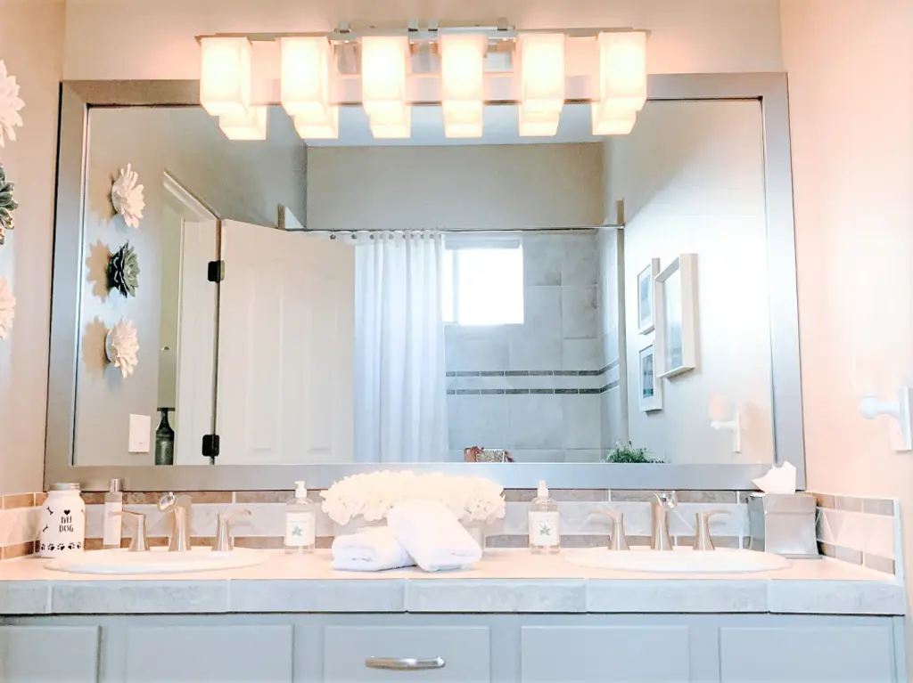 Brushed metallic tones are paired with the unpretentious lines of the Meade to create a contemporary framed mirror. The shallow depth of the Meade makes this an ideal choice for areas with limited space.Hangrail for installation will be applied on the width of the frame. All assembly hardware and instructions will be included. Additional hangrails are included if the opposite orientation is desired for installation. The dimensions displayed are the final outside dimensions of the frame, including the mirror. CATII safety backing applied on all mirrors. Approved for high-moisture areas such as bathrooms.