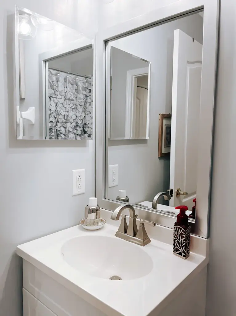 Brushed metallic tones are paired with the unpretentious lines of the Meade to create a contemporary framed mirror. The shallow depth of the Meade makes this an ideal choice for areas with limited space.Hangrail for installation will be applied on the width of the frame. All assembly hardware and instructions will be included. Additional hangrails are included if the opposite orientation is desired for installation. The dimensions displayed are the final outside dimensions of the frame, including the mirror. CATII safety backing applied on all mirrors. Approved for high-moisture areas such as bathrooms.