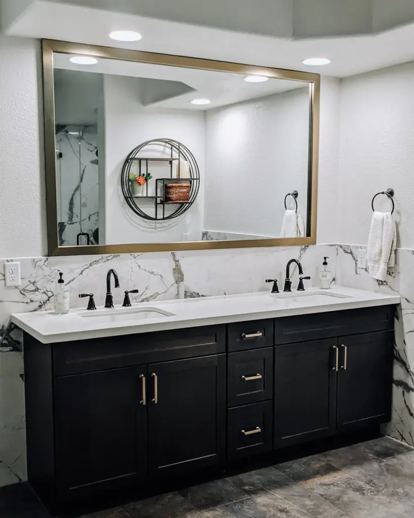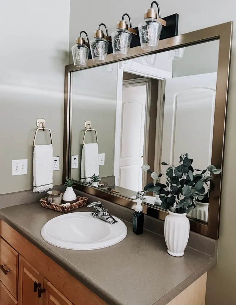 Brushed metallic tones are paired with the unpretentious lines of the Meade to create a contemporary framed mirror. The shallow depth of the Meade makes this an ideal choice for areas with limited space.Hangrail for installation will be applied on the width of the frame. All assembly hardware and instructions will be included. Additional hangrails are included if the opposite orientation is desired for installation. The dimensions displayed are the final outside dimensions of the frame, including the mirror. CATII safety backing applied on all mirrors. Approved for high-moisture areas such as bathrooms.