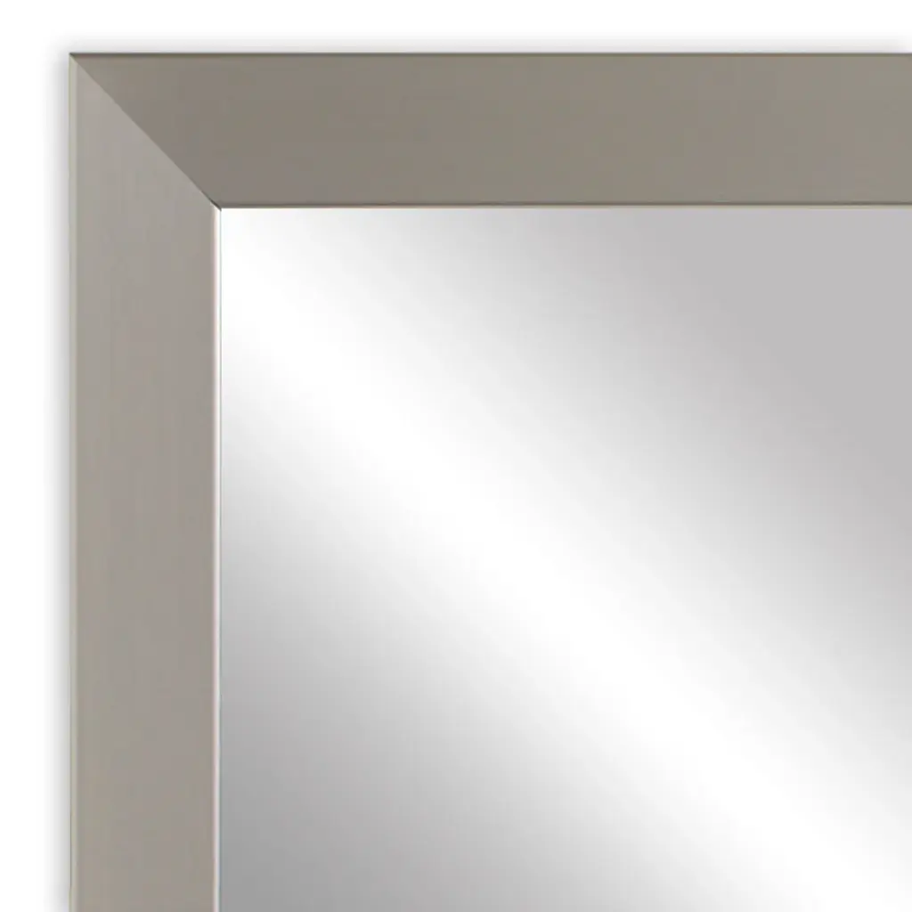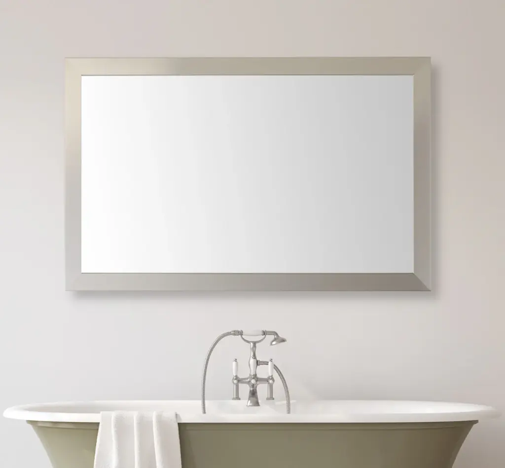 Brushed metallic tones are paired with the unpretentious lines of the Meade to create a contemporary framed mirror. The shallow depth of the Meade makes this an ideal choice for areas with limited space.Hangrail for installation will be applied on the width of the frame. All assembly hardware and instructions will be included. Additional hangrails are included if the opposite orientation is desired for installation. The dimensions displayed are the final outside dimensions of the frame, including the mirror. CATII safety backing applied on all mirrors. Approved for high-moisture areas such as bathrooms.