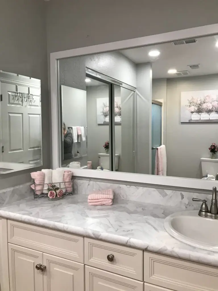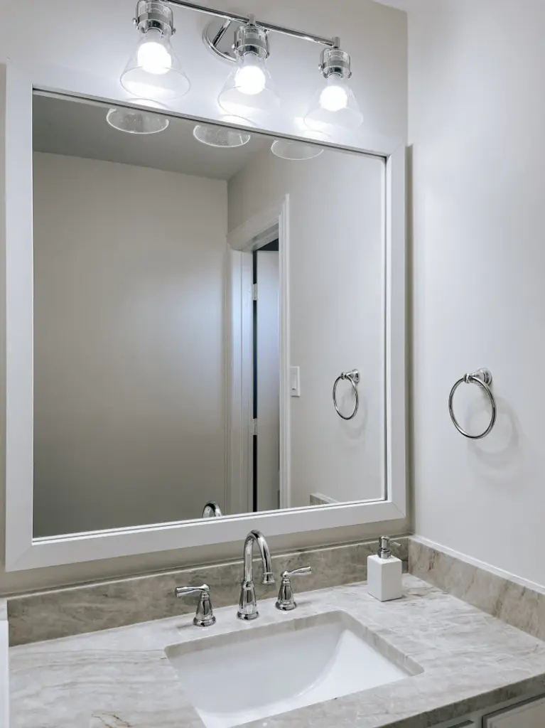 Brushed metallic tones are paired with the unpretentious lines of the Meade to create a contemporary framed mirror. The shallow depth of the Meade makes this an ideal choice for areas with limited space.Hangrail for installation will be applied on the width of the frame. All assembly hardware and instructions will be included. Additional hangrails are included if the opposite orientation is desired for installation. The dimensions displayed are the final outside dimensions of the frame, including the mirror. CATII safety backing applied on all mirrors. Approved for high-moisture areas such as bathrooms.