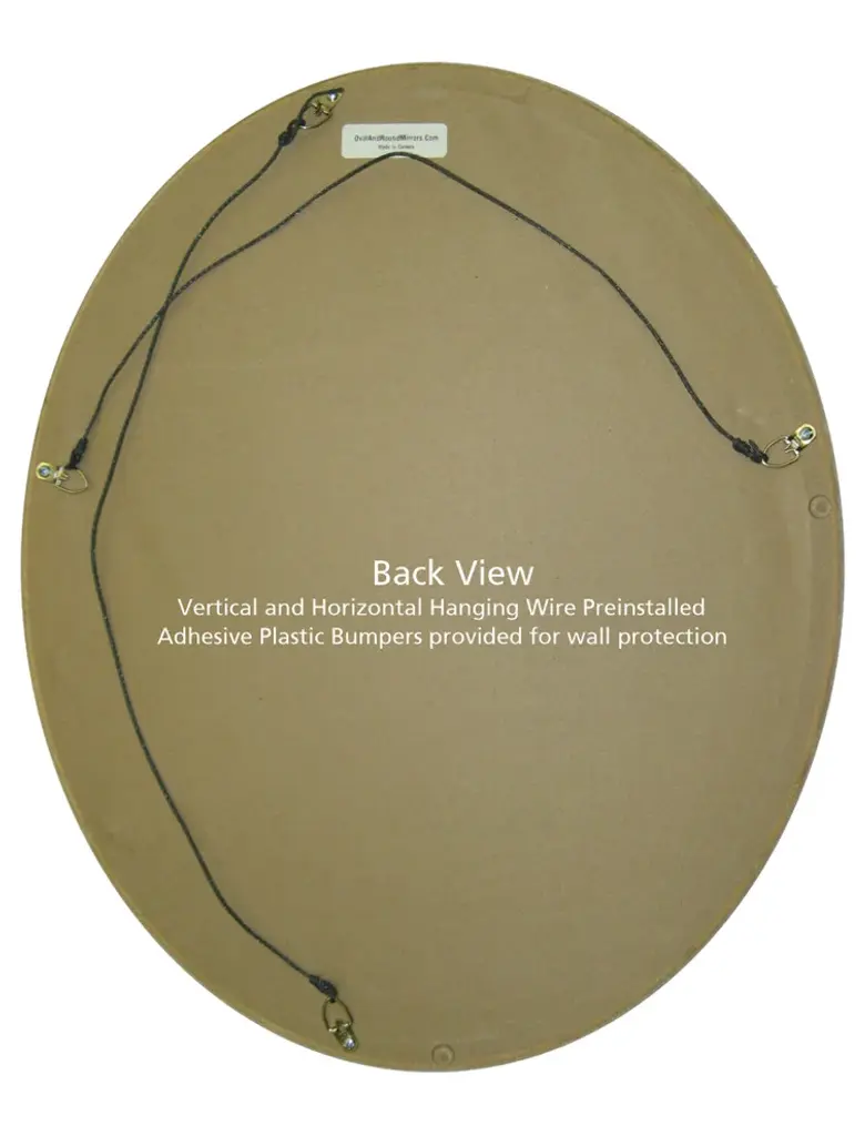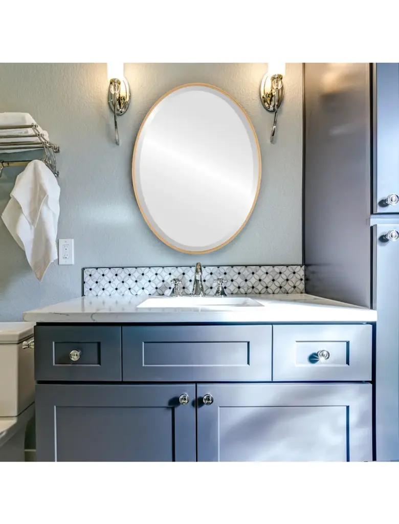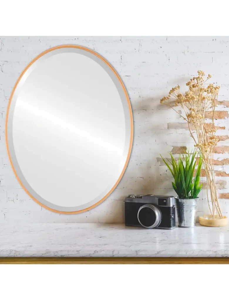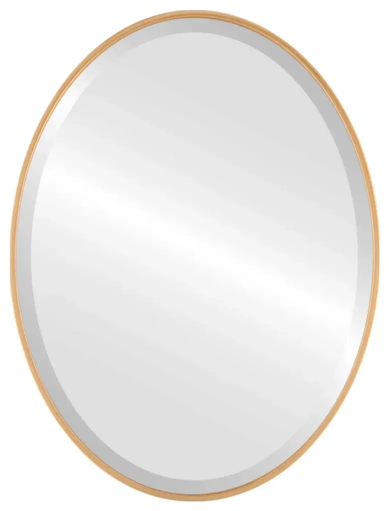 This striking oval wall mirror in our gold paint finish will add style to any room. The Medina oval mirror is one of our floater frames meaning that the mirror is attached to the frame from the front giving it the appearance of the mirror floating inside the frame without touching the edges. The simple, wide frame, is one of our thinnest frames giving it a modern look. Our gold paint finish is a solid gold lacquer with a medium gloss giving it a soft gold finish.For additional details on the Medina Gold Paint Oval wall mirror, see specifications and features below.Features:Gallery Quality, Wood, Hand Finished Oval FrameGallery Quality, Distortion Free Oval MirrorEasy to Hang - The Hanging Hardware is pre-installed for either vertical or horizontal hanging.Options:This oval frame comes with a 1" Beveled MirrorMultiple Colors and Sizes available.