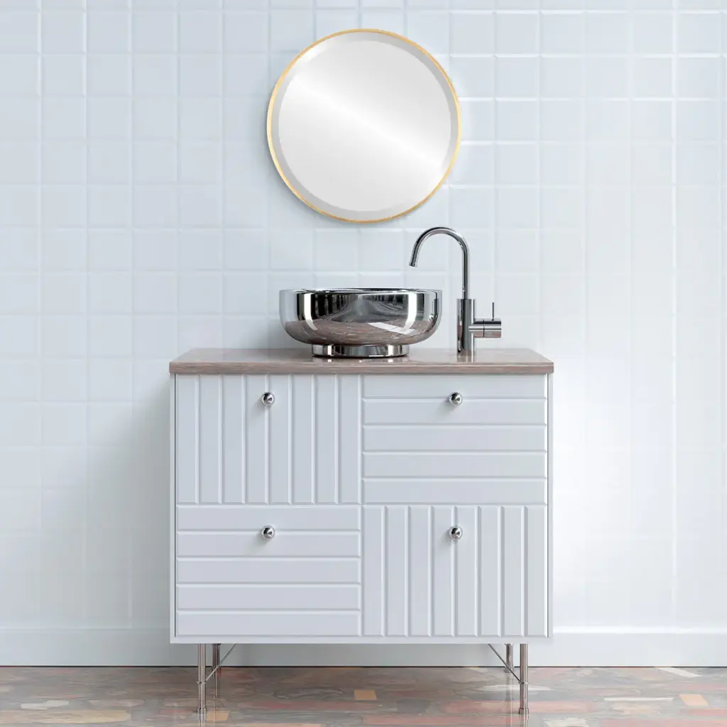 The simple, minimalist design of our Medina gold leaf round mirror will draw attention with it''s modern, classy look. As a floater frame, the frame appears to have the round mirror floating inside without touching the edges of the frame due to the mounting technique of the mirror. Artisans hand gild and age this frame using similar materials and techniques from hundreds of years ago creating the warm gold leaf finish.For additional details on the Medina Gold Leaf Round wall mirror, please see features and specifications below.Features:Gallery Quality, Wood, Hand Finished Round Frame Gallery Quality, Distortion Free Round Mirror Easy to Hang - The Hanging Hardware is pre-installed. Options:This round frame comes with a 1" Beveled MirrorMultiple Colors and Sizes available.