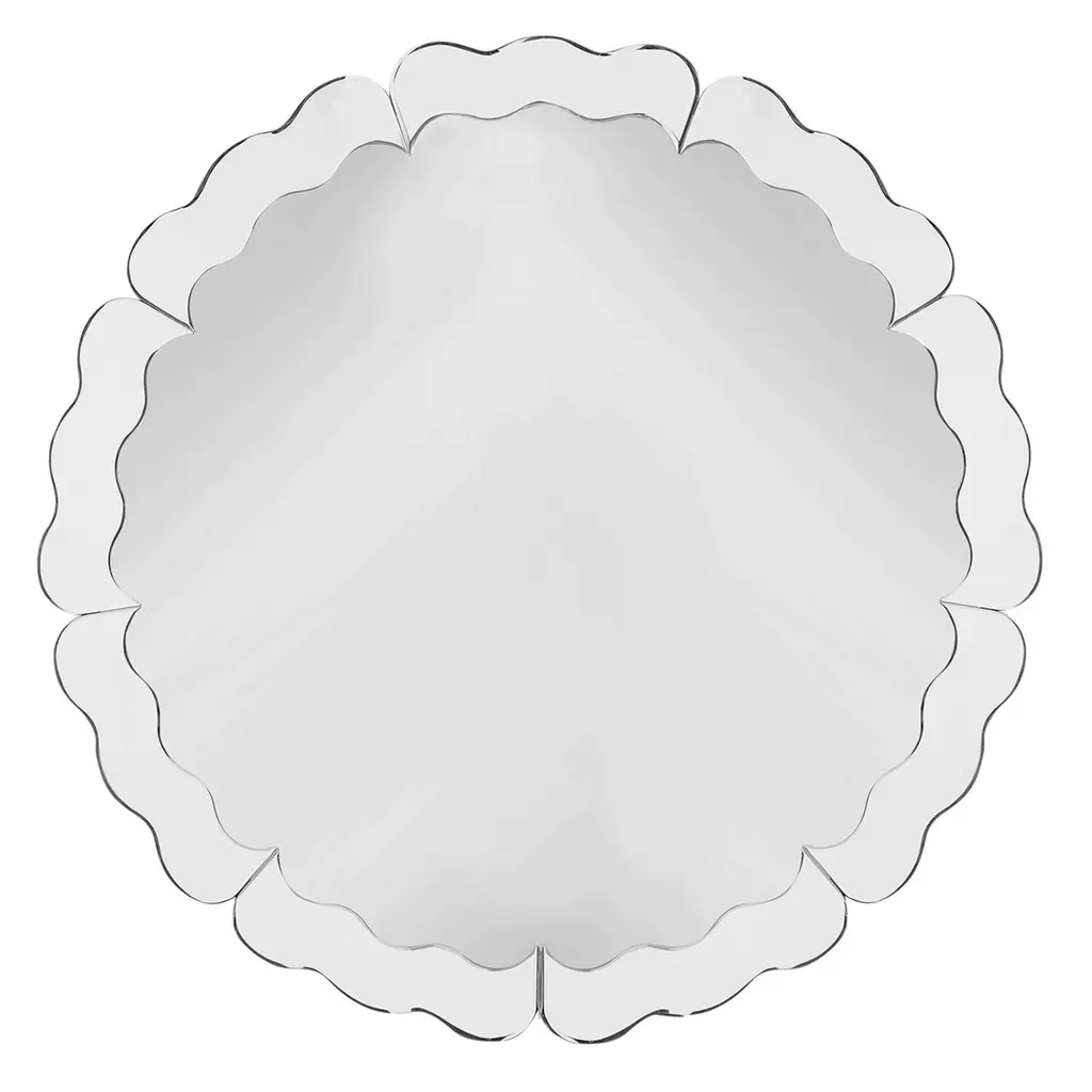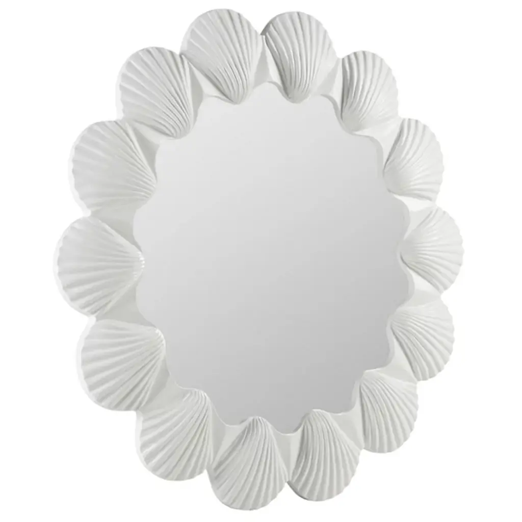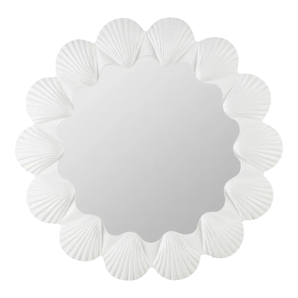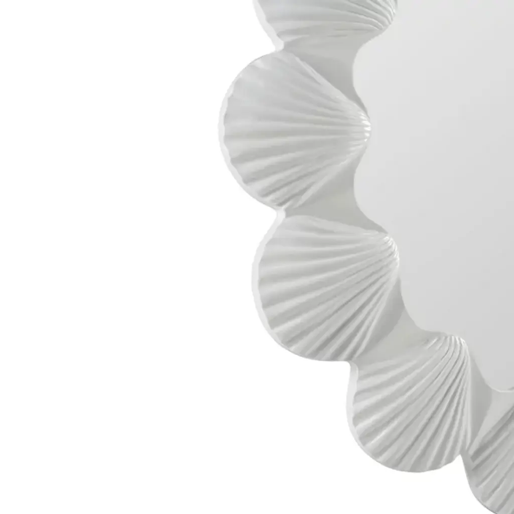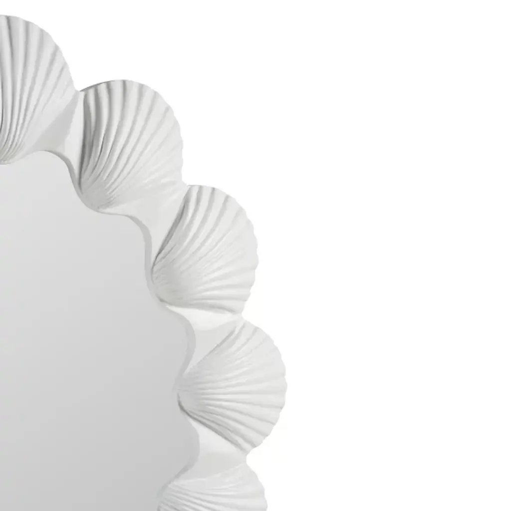The Megan Molten x Cooper Classics Bunny Wall Mirror from Cooper Classics turns polyurethane into a series of scalloped forms that encircle the mirror-like petals. Each shell-like segment maintains identical sizes, creating a harmonious border that appears to unfold around the center. The material allows for precise replication of complex shapes while ensuring each curve flows naturally into the next. This piece is particularly effective in powder rooms or dressing areas where its distinctive pattern can serve as a design centerpiece.
