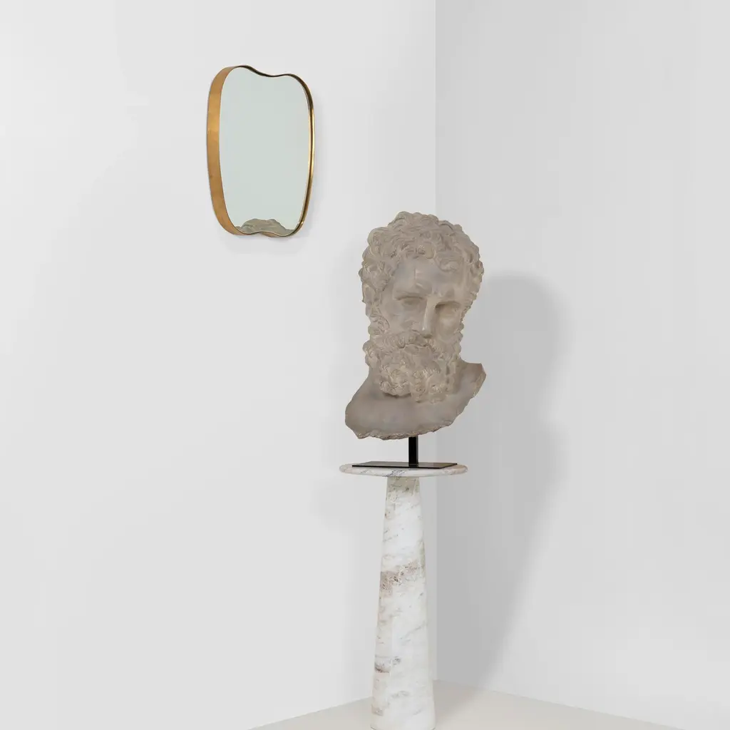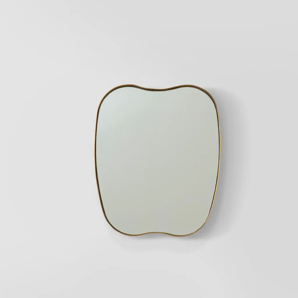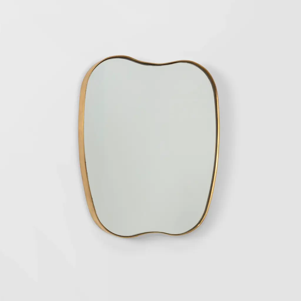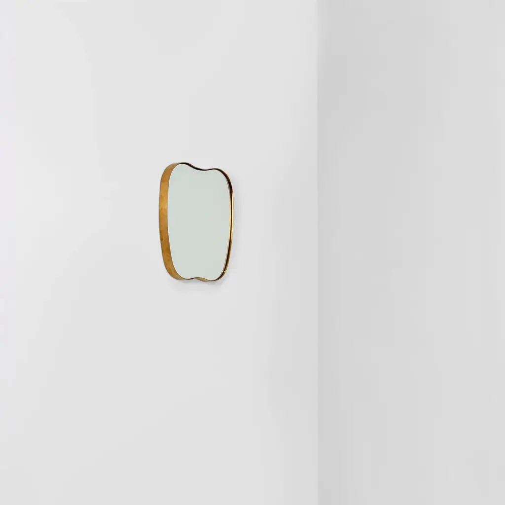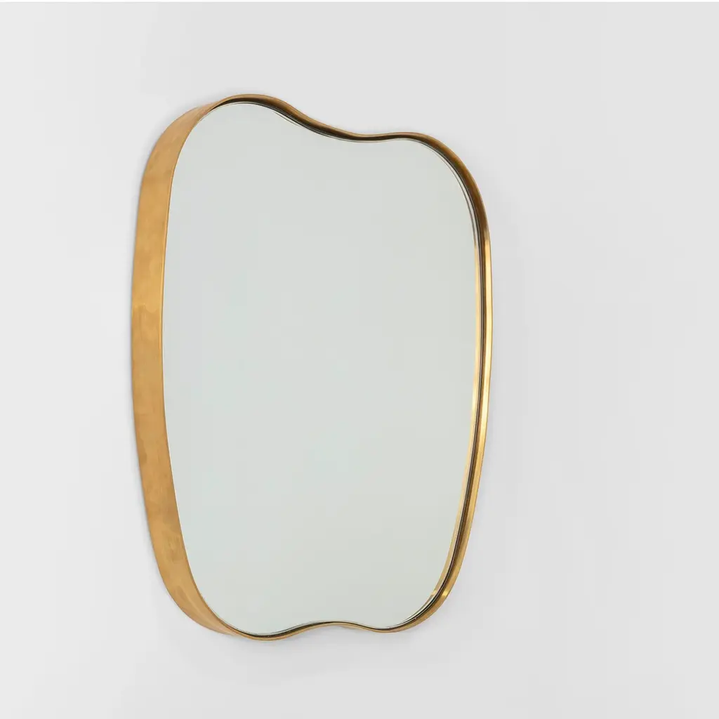 Inspired by a classic mid-century shape, this mirror features a sleek brass frame. Perfect for wall hanging in hallways or bedrooms. Numbered