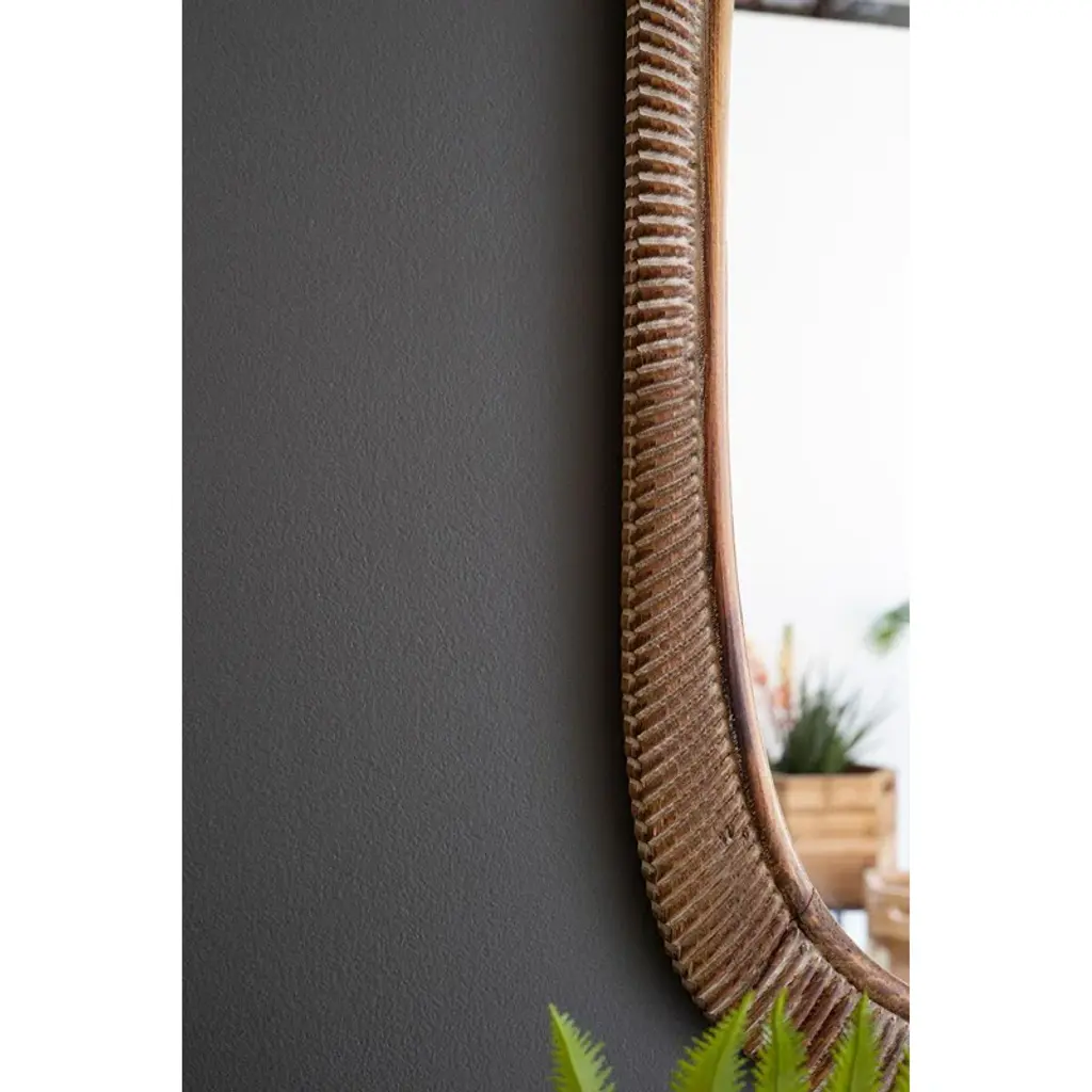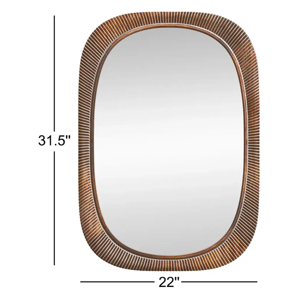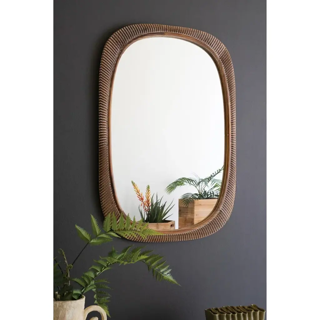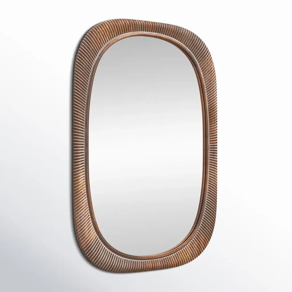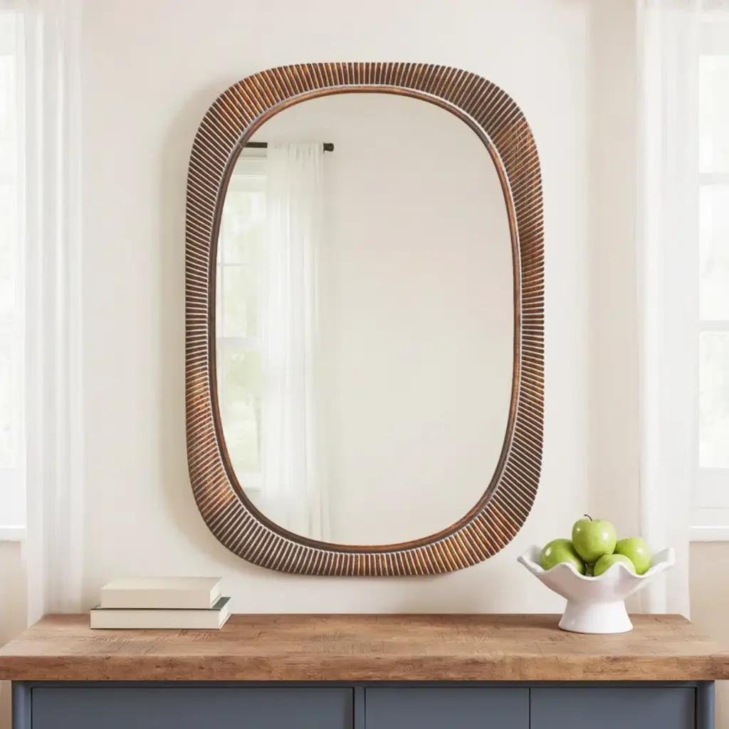 Hang one of these carved wooden framed mirrors with a curvy squoval shape. This mirror suits masculine or classic styles with wooden themes. Make it the centerpiece, shaving mirror, or accent in a small bathroom.
