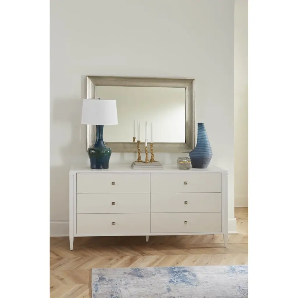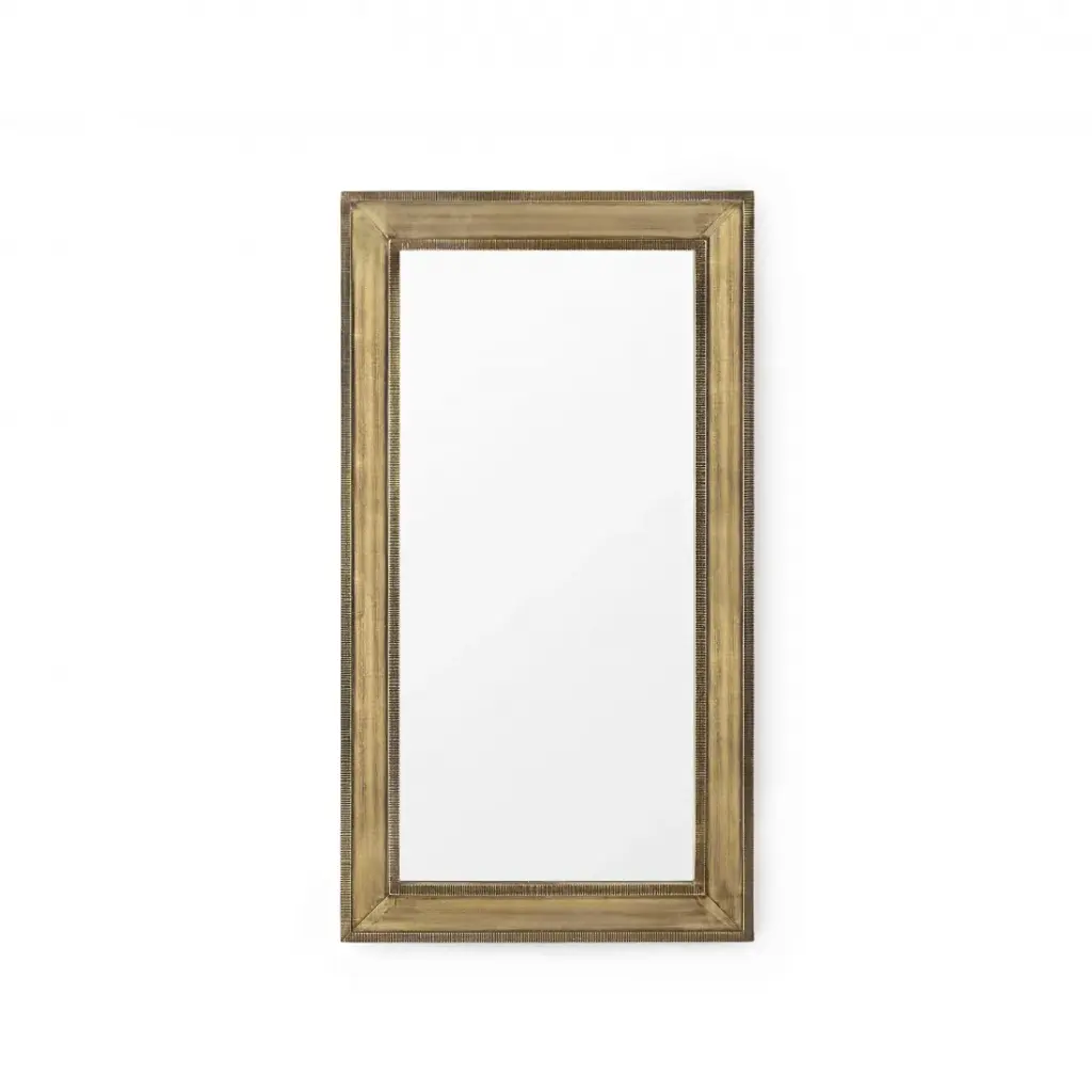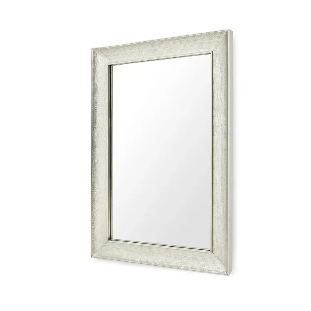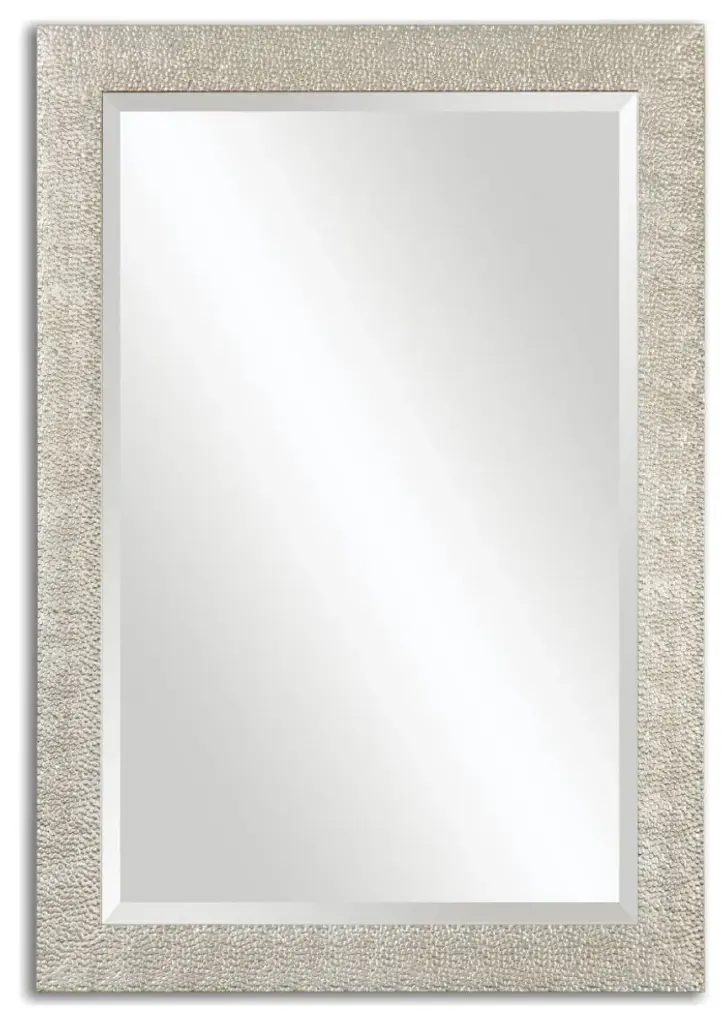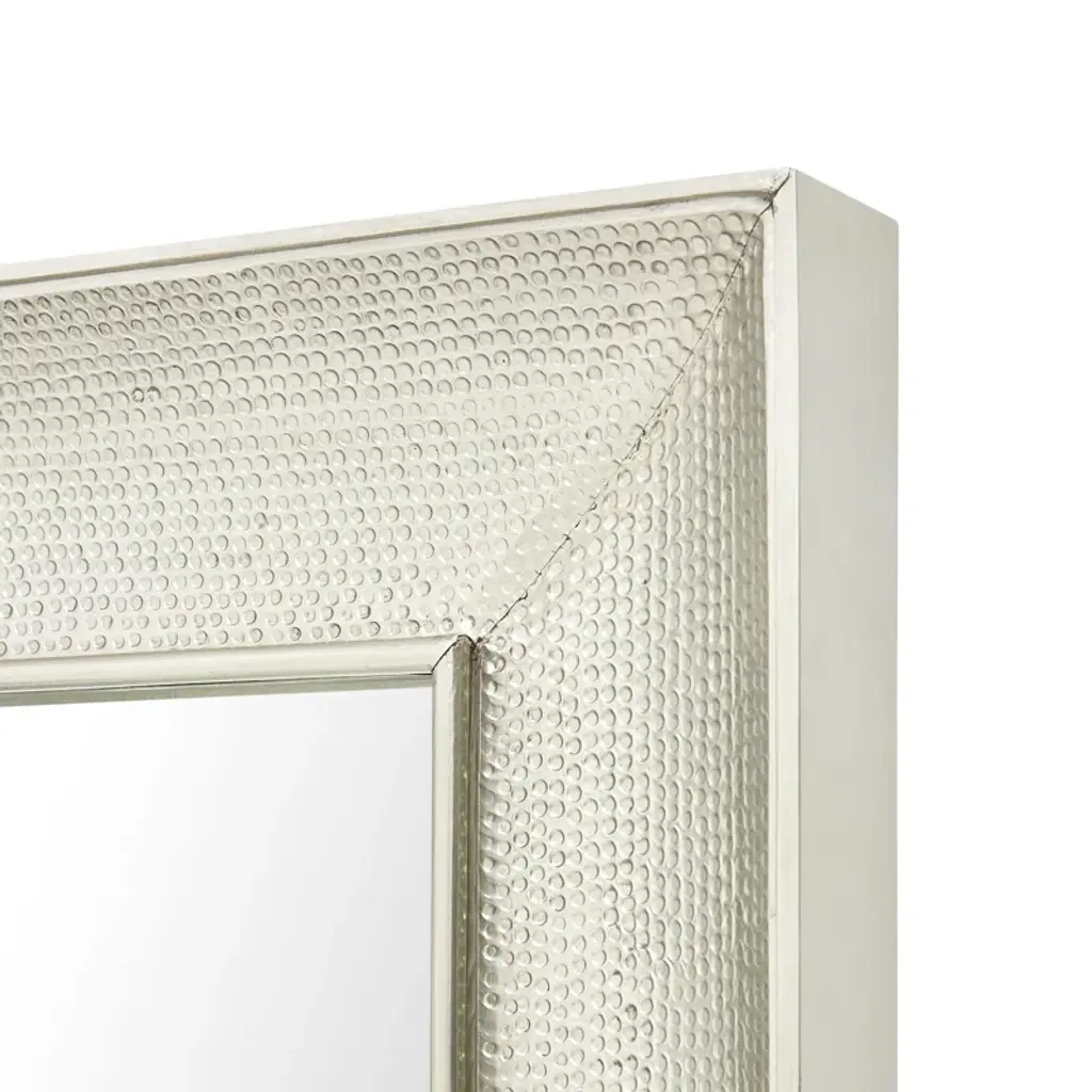The Melinda Mirror features a simple rectangular frame embellished with a hand-hammered, dimpled pattern. Each one is made by a master craftsman and bears the distinctive and unique hand of its maker.