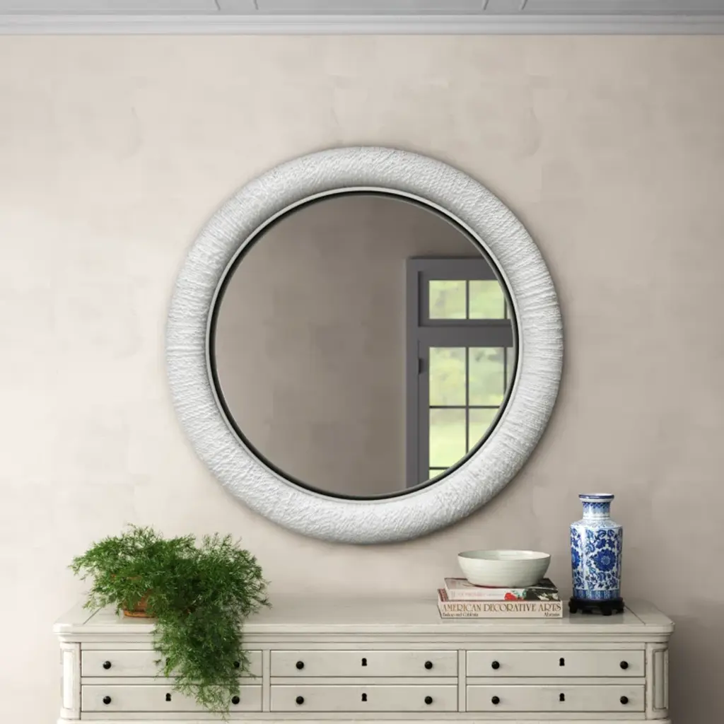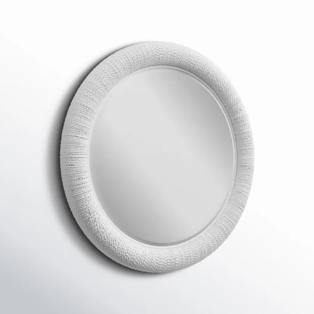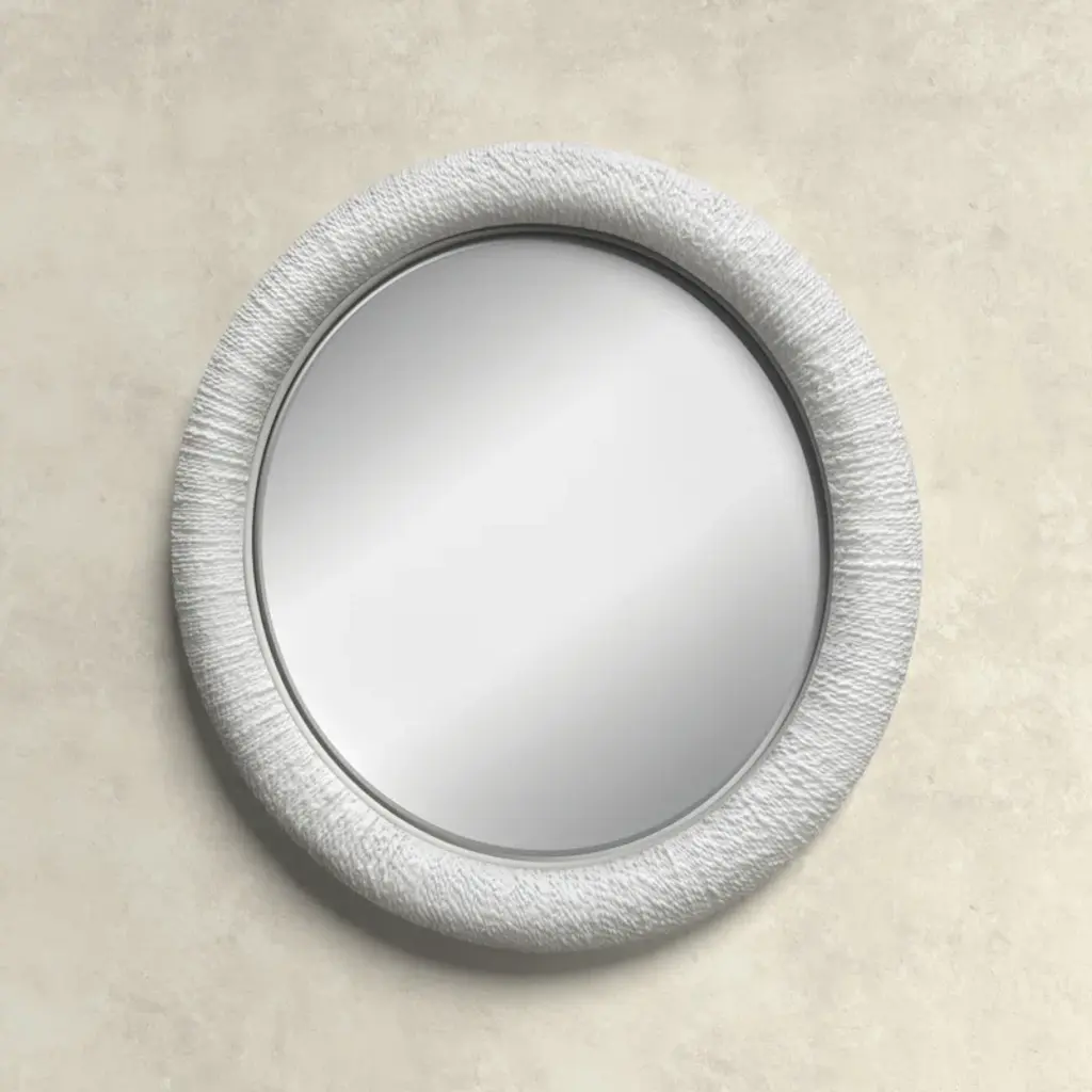 A casual yet sophisticated nod to classic coastal style, this mirror features a rounded frame made of natural woven banana plant accented with a rattan inner edge all finished in matte white. Mirror has a generous 1.5 bevel.