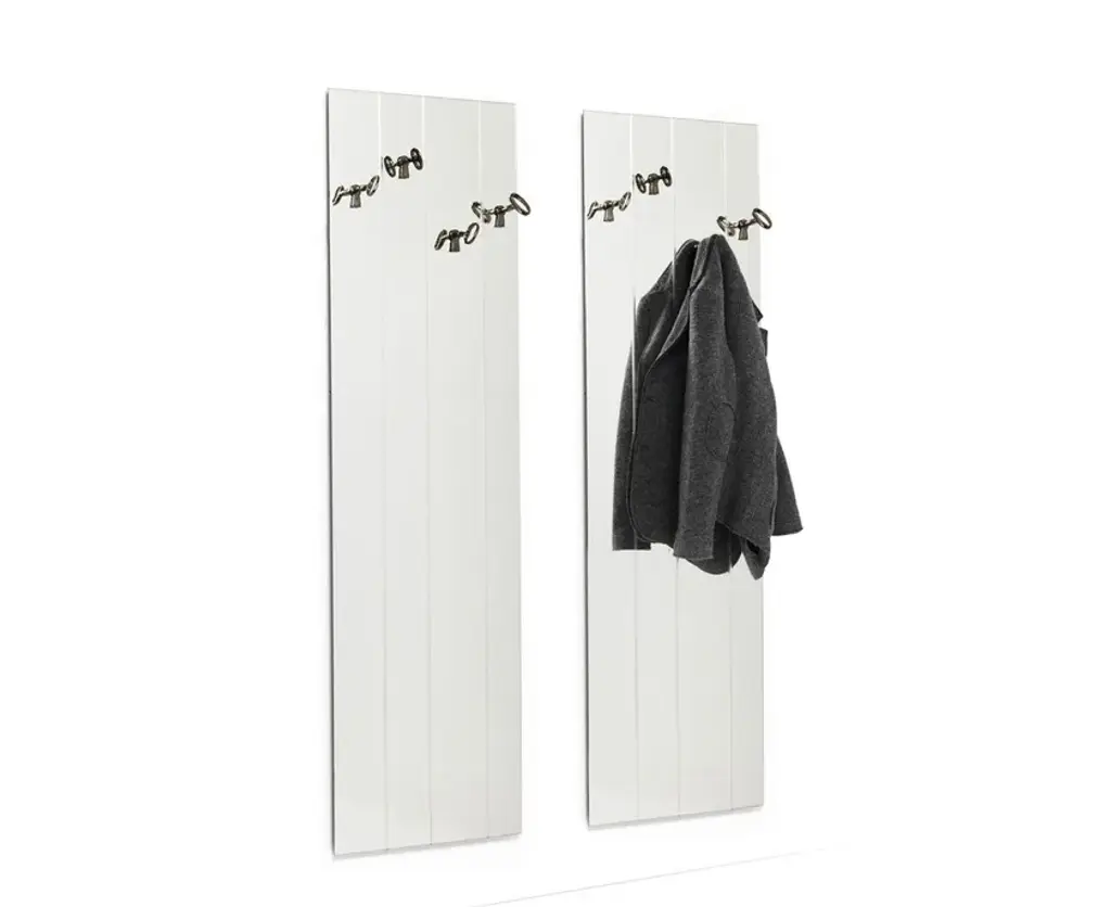 Memorie is a wall mirror with four coat hooks made of cast brass in a polished black nickel finish. Designed for vertical mounting only.