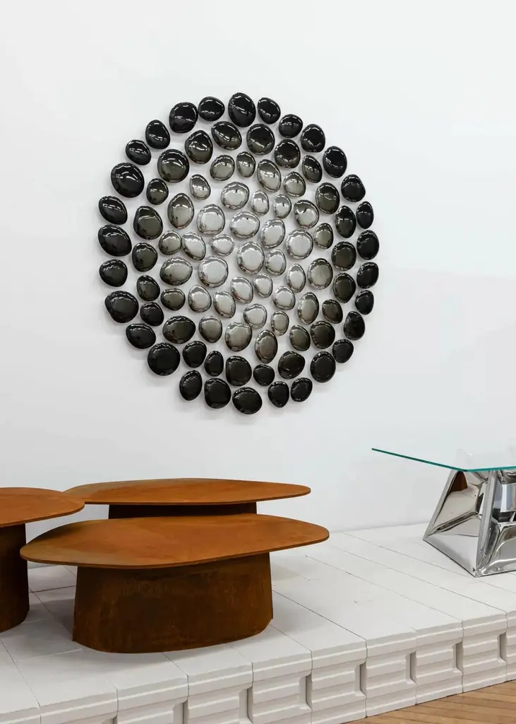 Mercury Dark Matter Wall Mirror by ZietaDimensions: D 4 x Ø 150 cm. Material: Stainless steel. Also available in polished stainless steel finish. Please contact us.Zietas main goal is to deliver uniqueness and customization in design and construction while keeping the production, transport, and warehousing innovatively efficient.This is how they imagine the future world: Light, durable structures of customized applications produced on demand out of one-of-a-kind parts, yet efficiently.They use a computer-controlled production process. Customized pattern, customized form, customized function, one-of-a-kind product, and outstanding precision are what they deliver.You will find all of this philosophy reflected in the products. They research, they discover new possibilities, they play with forms and they deliver a beautiful, innovative, surprising outcome to people who love the design and who care about design development.They believe their work is a valuable contribution to the world of design not only by the unique beauty of the forms but most of all by opening ultra-innovative opportunities of forming and new paths for the world of the future.
