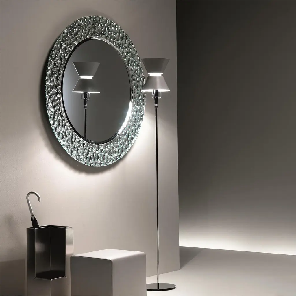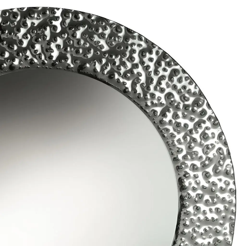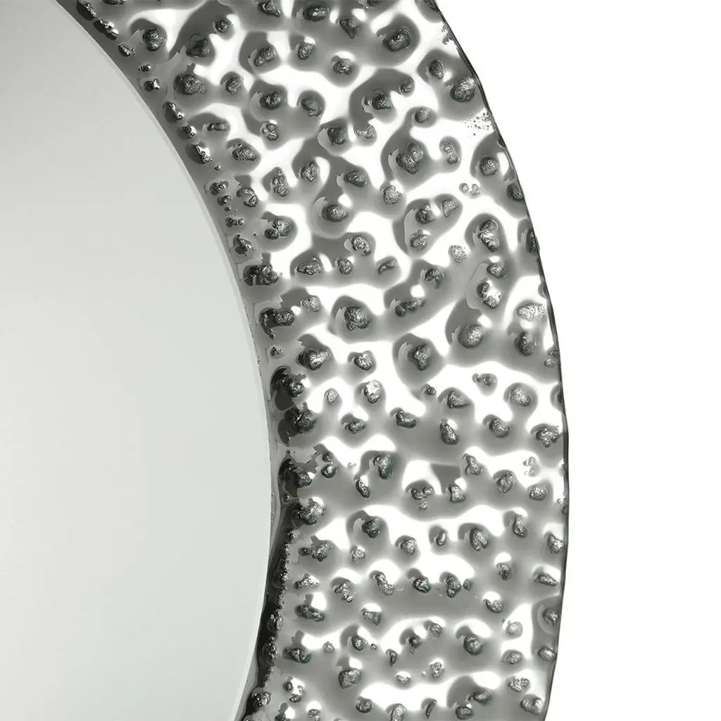 Mirror mercury round with fused glass frame with back-silvered,8 mm thickness. With glass relief ornament on frame, rear frame inpainted metal. With round flat glass mirror, 5mm thickness.It can be hung vertically or horizontally.