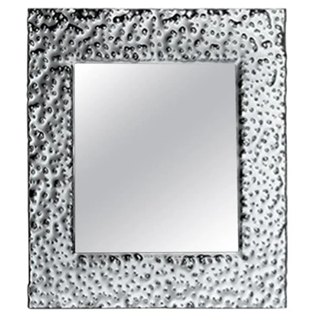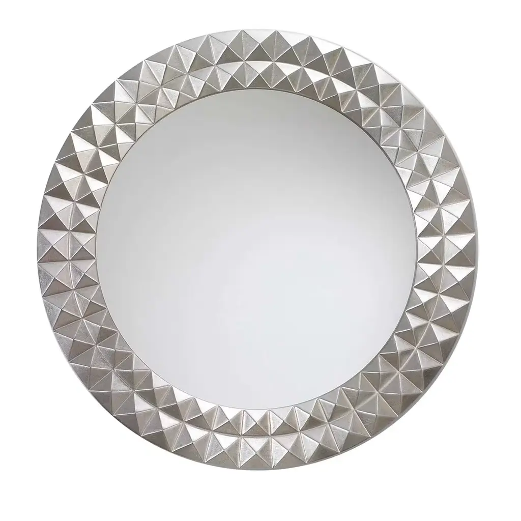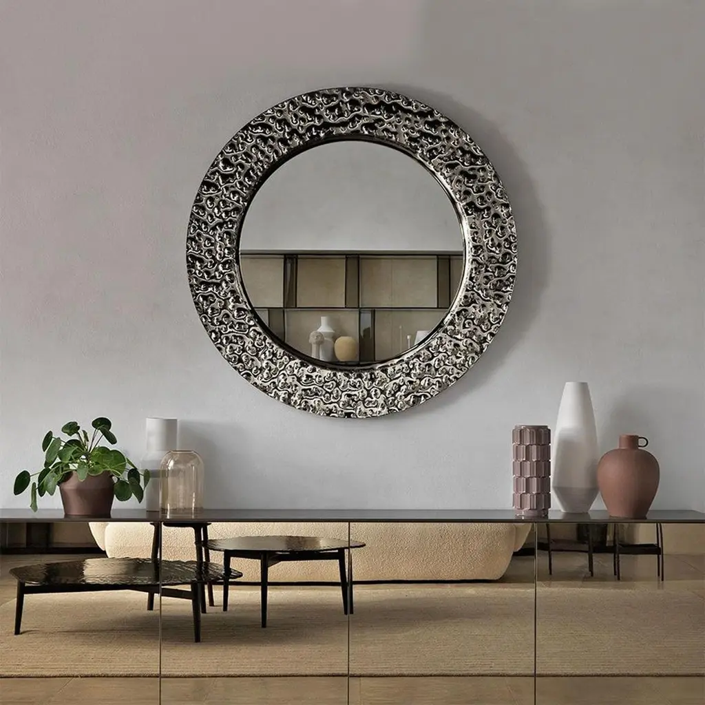 Mirror mercury round with fused glass frame with back-silvered,8 mm thickness. With glass relief ornament on frame, rear frame inpainted metal. With round flat glass mirror, 5mm thickness.It can be hung vertically or horizontally.