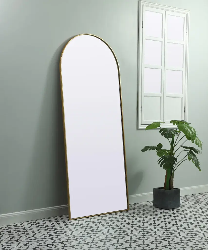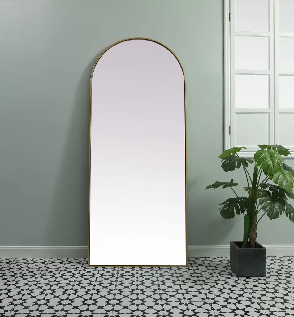 Instantly open up any space in your home with this minimalist wall-mounted mirror. Crafted of metal, this mirror strikes a round silhouette. Its slender, clean-lined frame sports a classic finish, while the glass mirror within features a flat, for a brilliant reflection, letting the light bounce off to expand your space. Designed in an arch shape, this metal-frame mirror showcases in the three available satin finishes in black, brass, or silver. Mount this work of art in any room of your choice for added visual impact.Versatile arched-top full length mirror provides a full body view in two ways: leaned it against the wall or mount it on any secure wall to save space. (mounting hardware is not provided)the mirror comes with a solid MDF board backing and two welded keyhole hanger for easy installationMirror is recessed into the ultra-thin iron sturdy metal frameperfect accent mirror to add visual interest and depth to your bedroom, living room, bathroom, entry way or any room!this mirror can only be installed in a vertical orientationmirror arrives at your home in one piece with no installation requiredglass insert measures 31.22 inch wide X 0.15 inch deep X 75.22 inch high