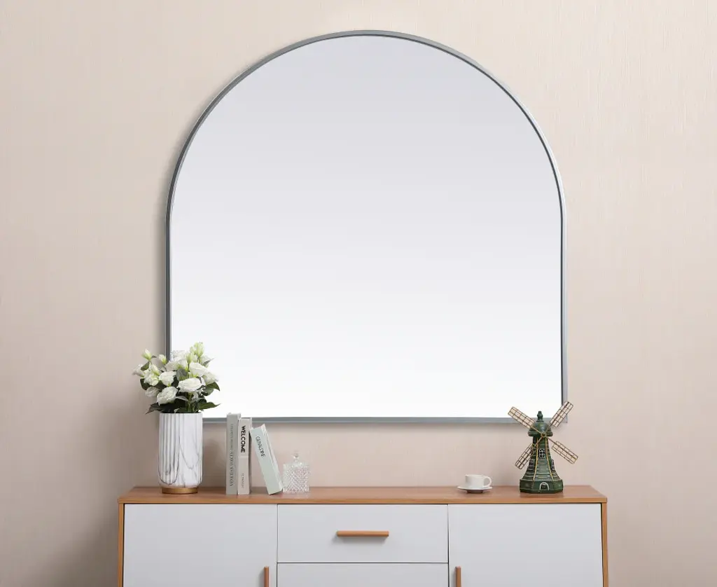 Instantly open up any space in your home with this minimalist wall-mounted mirror. Crafted of metal, this mirror strikes a round silhouette. Its slender, clean-lined frame sports a classic finish, while the glass mirror within features a flat, for a brilliant reflection, letting the light bounce off to expand your space. Designed in an arch shape, this metal-frame mirror showcases in the three available satin finishes in black, brass, or silver. Mount this work of art in any room of your choice for added visual impact.timeless silhouette with an arched top for added intriguethe mirror comes with a solid MDF board backing and one welded keyhole hanger for easy installationMirror is recessed into the ultra-thin iron sturdy metal frameperfect accent mirror to add visual interest and depth to your bedroom, living room, bathroom, entry way or any room!this wall-mounted mirror can only be installed in a vertical orientationmirror arrives at your home in one piece with no installation requiredglass insert measures 35.22 inch wide X 0.15 inch deep X 35.22 inch high
