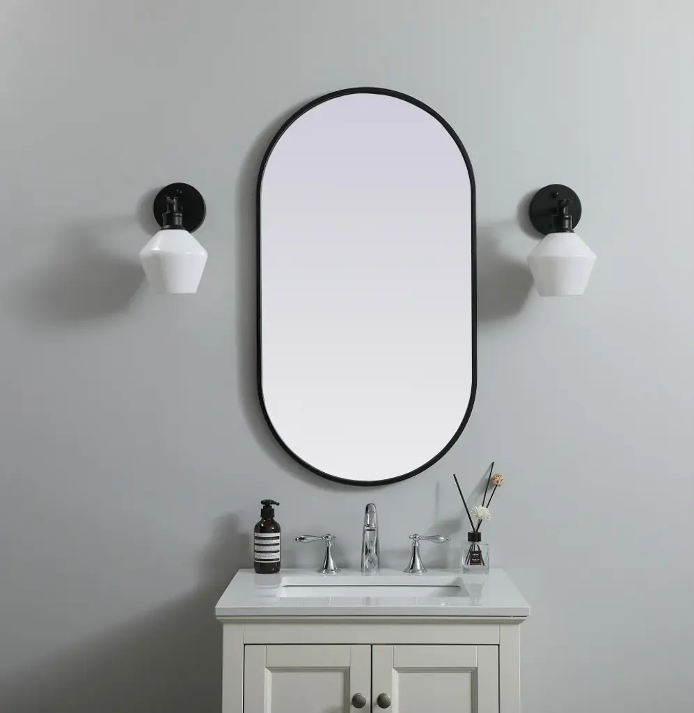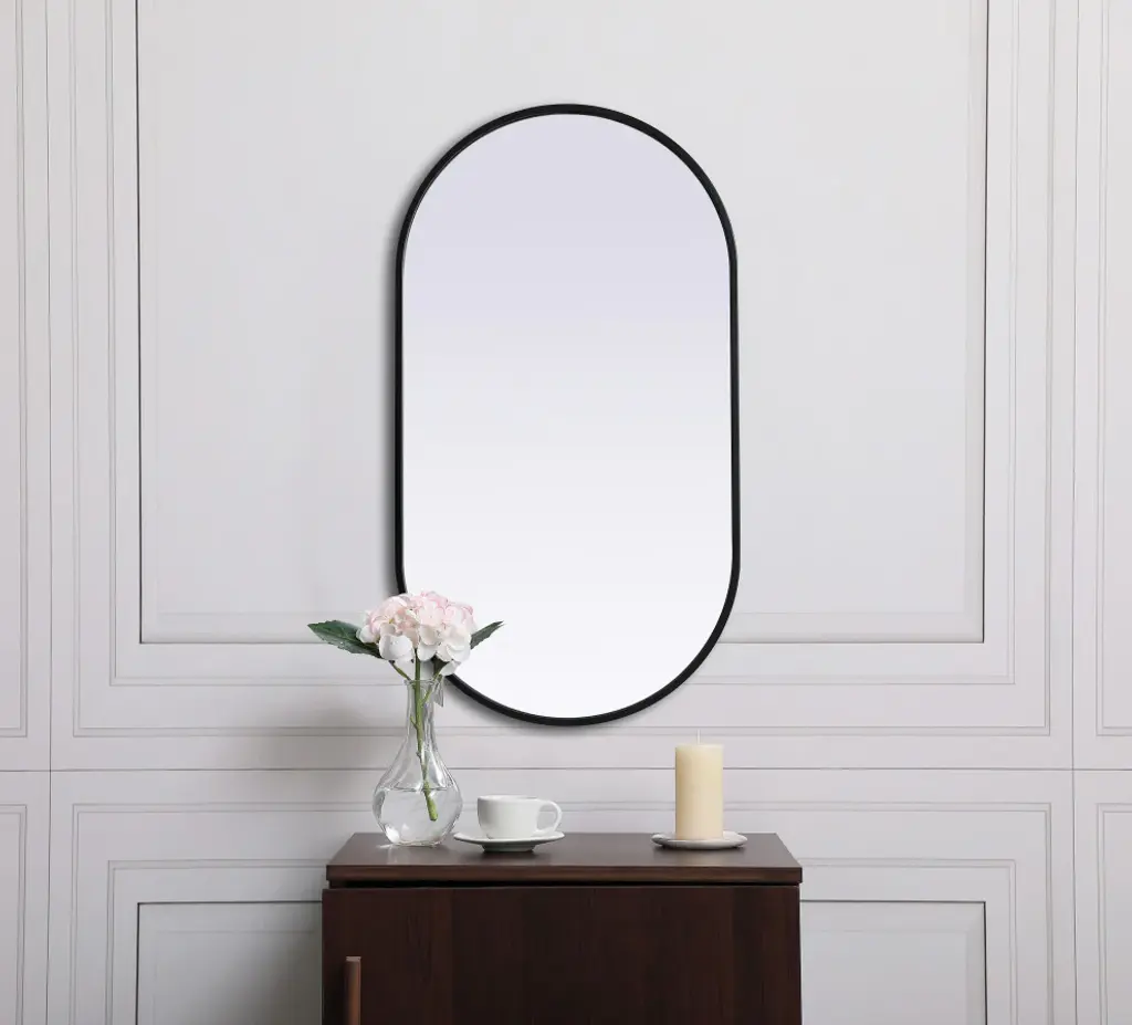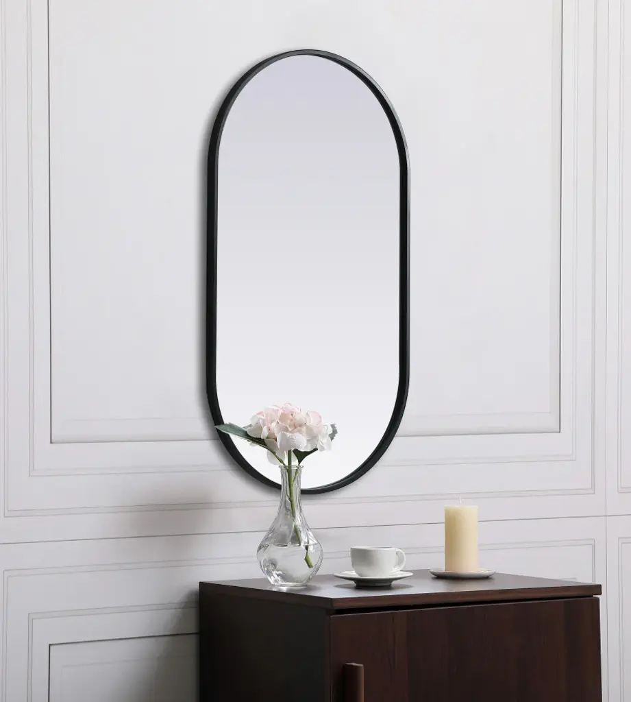 Instantly open up any space in your home with this minimalist wall-mounted mirror. Crafted of metal, this mirror strikes a pill-shaped silhouette. Its slender, clean-lined frame sports a classic finish, while the glass mirror within features a flat, for a brilliant reflection, letting the light bounce off to expand your space. Designed in a pill shape, this metal-frame mirror showcases in the three available satin finishes in black, brass, or silver. Mount this work of art in any room of your choice for added visual impact.Modern pill-shaped silhouette mirror is an architectural accent in your home. the mirror comes with a solid MDF board backing and three welded keyhole hanger for easy installationMirror is recessed into the ultra-thin iron sturdy metal frameperfect accent mirror to add visual interest and depth to your bedroom, living room, bathroom, entry way or any room!can be mounted both in a vertical or horizontal orientationmirror arrives at your home in one piece with no installation requiredglass insert measures 19.22 inch wide X 0.15 inch deep X 35.22 inch high